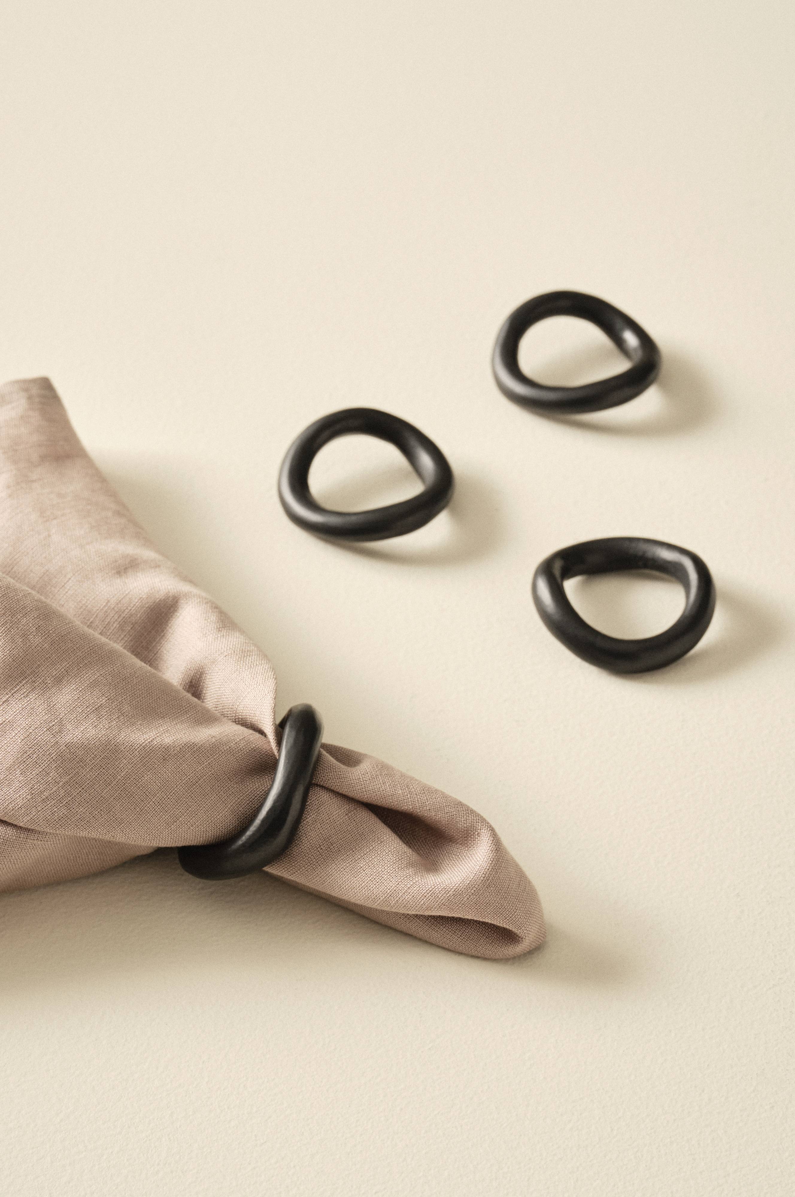 4 Serviettenringe aus Aluminium. Zusammen mit Stoffservietten verleihen diese organisch-unregelmäßig geformten Ringe deiner Tischdeko eine softe Optik. Matte, pulverbeschichtete Oberfläche.