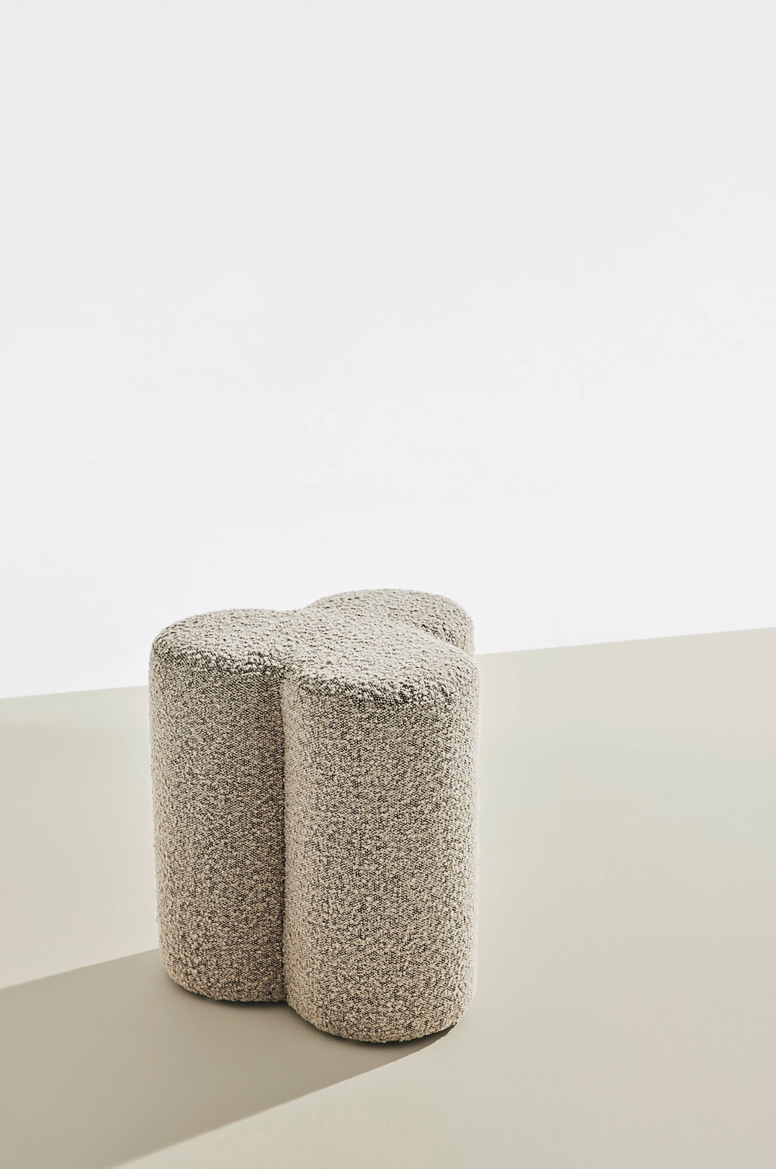 Der Pouf in Kleeblattform fungiert als Hocker oder Fußhocker gleichermaßen gut wie als Beistelltischchen mit einem Tablett darauf. Der Pouf hat einen Bezug aus weichem Bouclé. Dieser Stoff erhält sein softes, leicht lockiges Finish durch ein spezielles Garn, das kleine Schlingen und Knötchen aufweist. Die äußerst strapazierfähige Qualität hat eine Scheuerfestigkeit von 79.000 Martindale. Der Korpus aus FSC-zertifiziertem Kiefernholz und Sperrholz ist bequem und zugleich fest gepolstert.