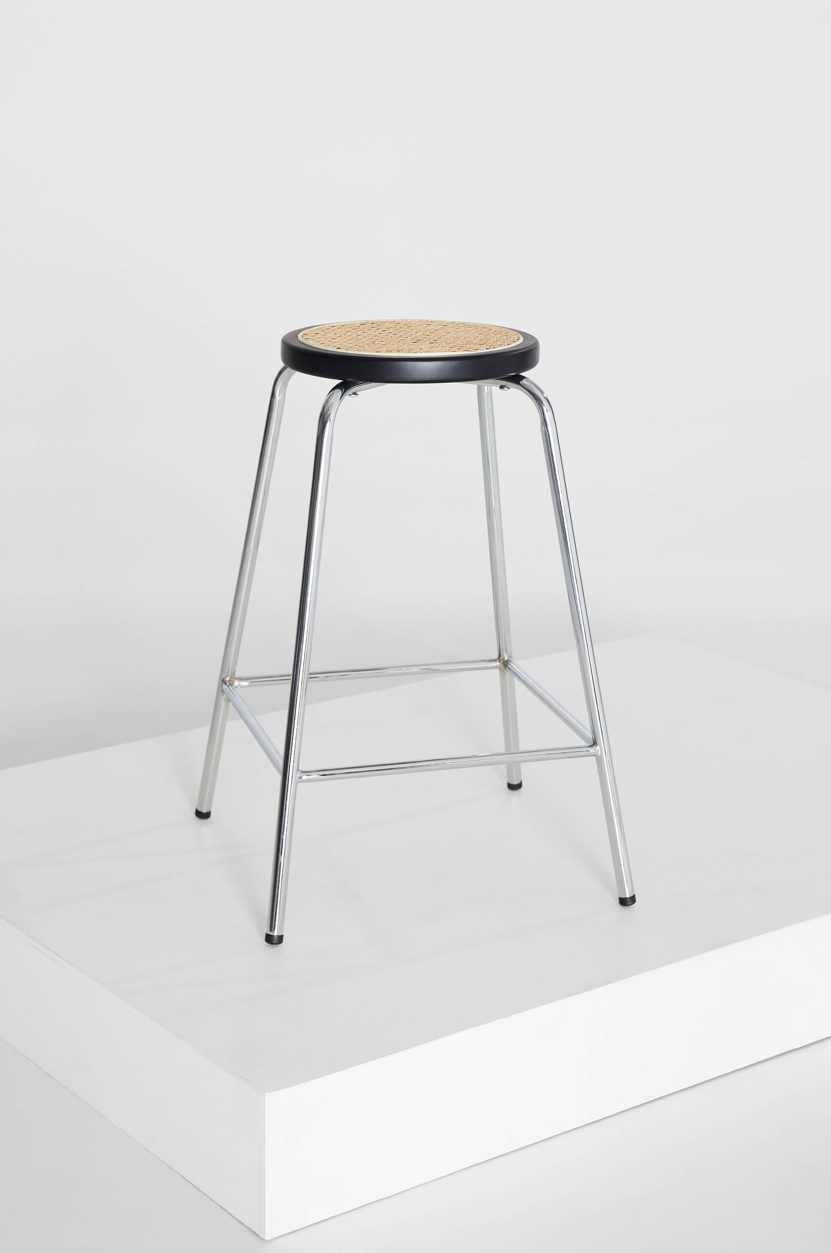Die Kollektion Meraki zeichnet sich durch verchromtes Stahlrohr, schwarz lackiertes Birkenholz und naturfarbenes Rattan aus. Eine trendige Kombination aus Eleganz und Retro-Look. Der Hocker hat eine klassische Ausstrahlung. Die verchromten Beine sind nach außen gewinkelt und haben bequeme Fußstreben, die für Sitzkomfort und zusätzliche Stabilität sorgen. Der Rattansitz hat einen Rahmen aus FSC-zertifiziertem Birkenholz.