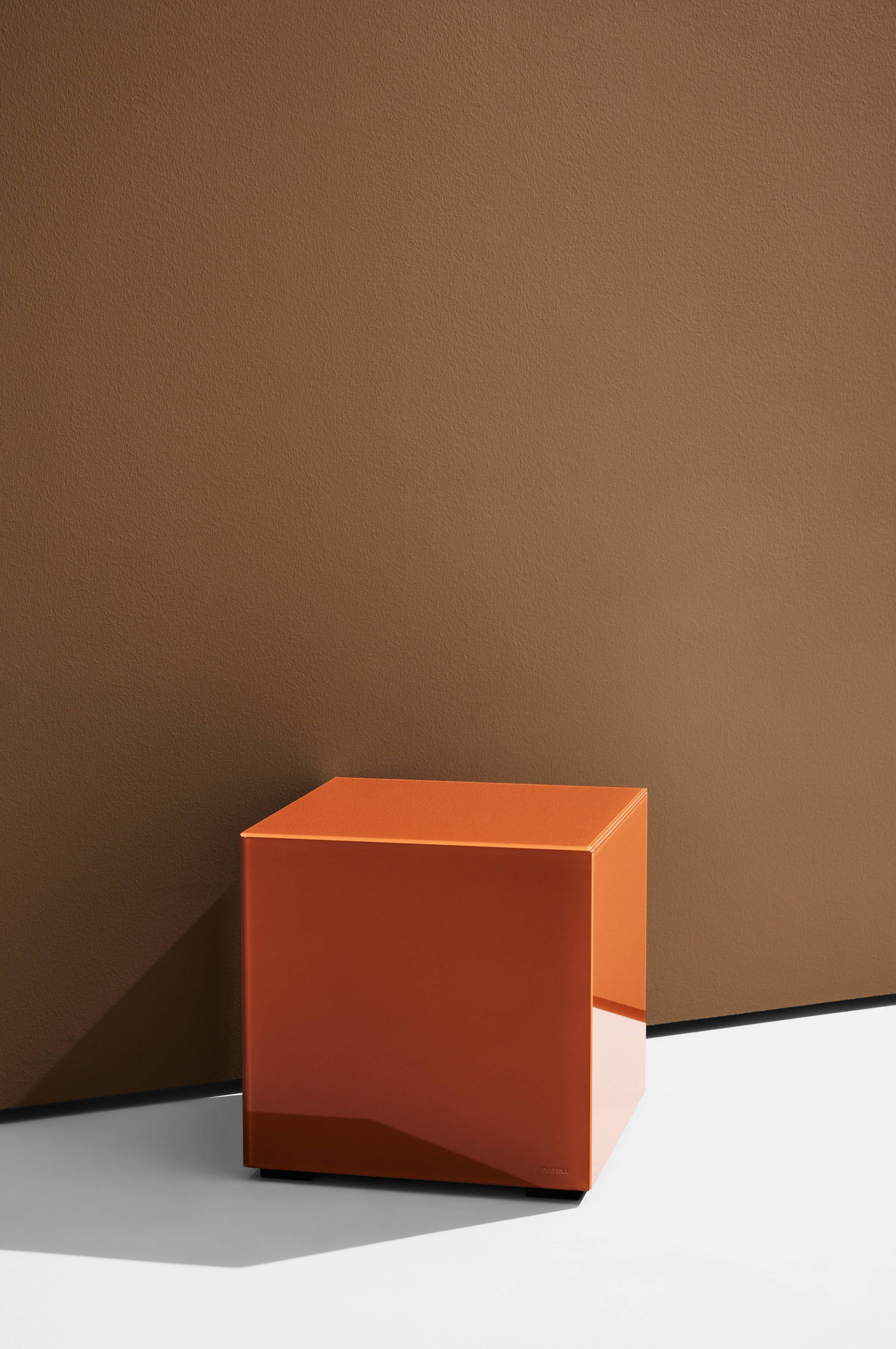 Als echter Eyecatcher zieht dieser Würfel die gesamte Aufmerksamkeit auf sich. Die Seiten und die Deckplatte bestehen aus Glas, und da die Innenseite farbintensiv lackiert ist, entsteht ein toller Effekt. Kleine verdeckte Füße erwecken den Eindruck, als würde der Würfel leicht schweben. Der Korpus aus FSC-zertifiziertem MDF ist mit Spiegelglas verkleidet. Pop ist jung und frech ‒ an ihm kommt man einfach nicht vorbei.