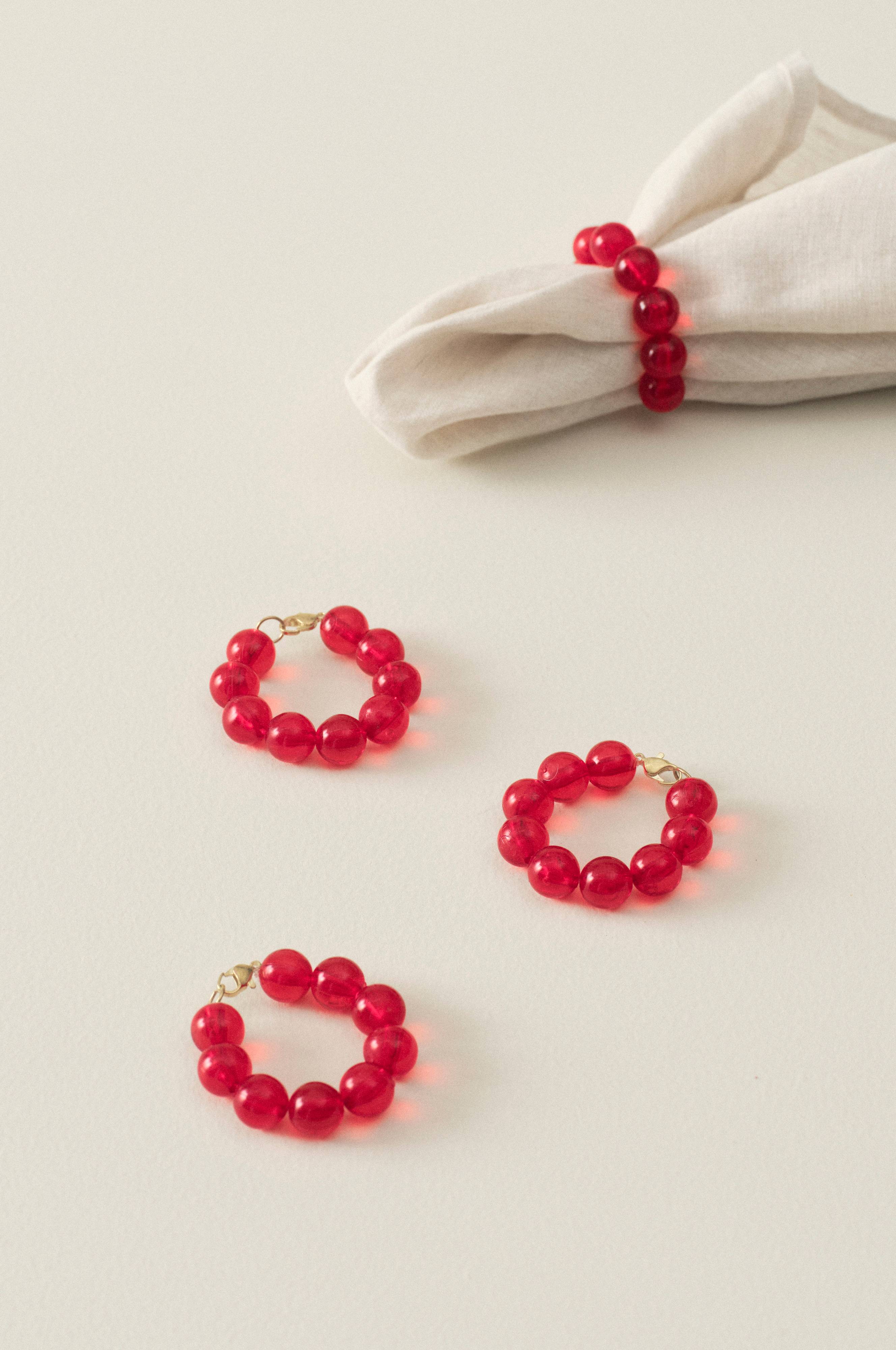 4 Serviettenringe aus Acrylglasperlen in schönen Farben. Dank des kleinen Verschlusses lassen sich die Ringe mühelos um deine Servietten legen. Außerdem kannst du mit dem Perlenband natürlich auch vieles andere dekorieren.