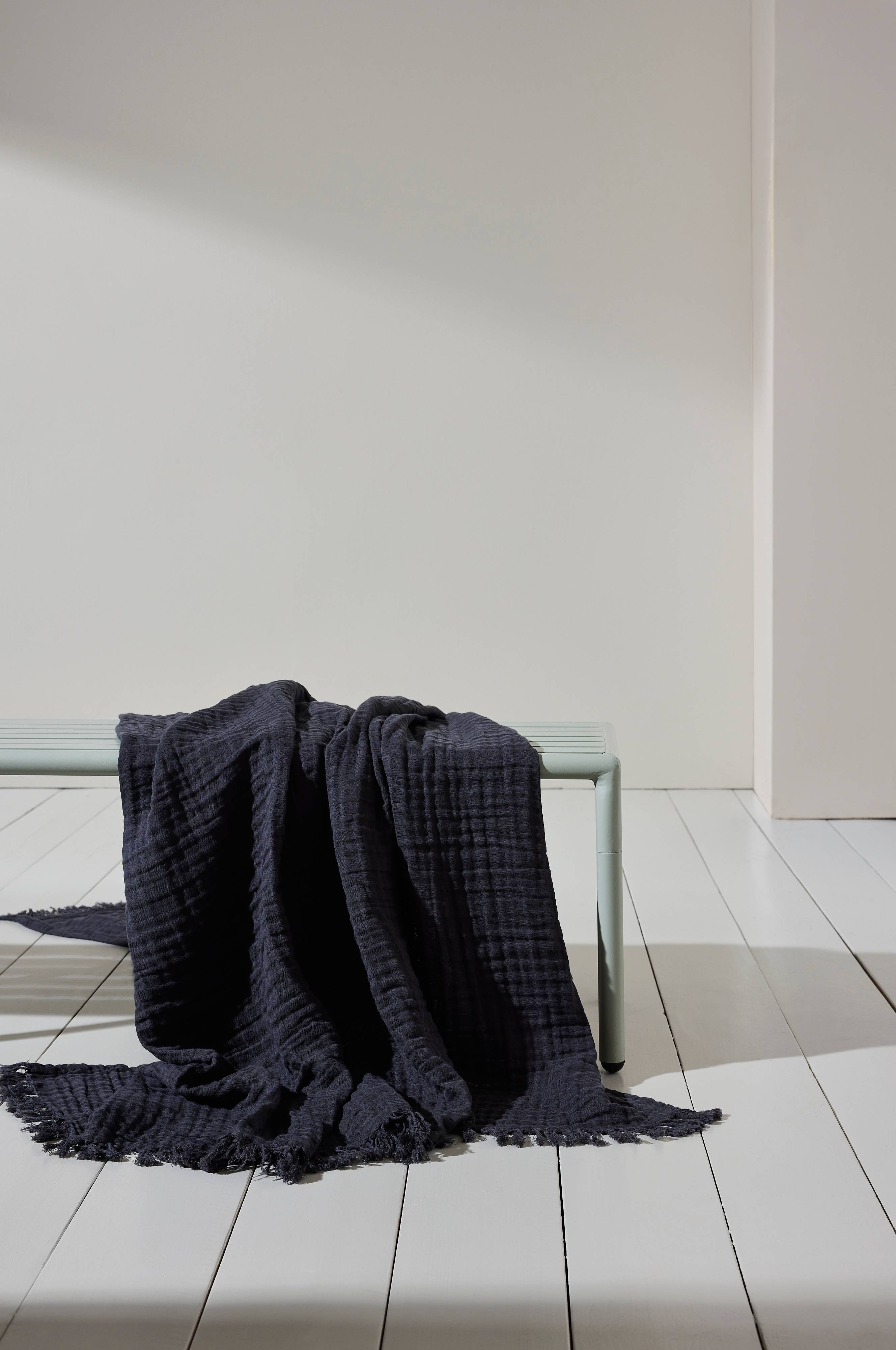 Dieses einfarbige Plaid besteht aus einem weichen Baumwollstoff mit leicht bauschiger Struktur und ist daher schön luftig und kühl. Die Enzymwäsche sorgt für den angesagten Used-Look. Die Fransen an den kurzen Seiten sind schön zerzaust.