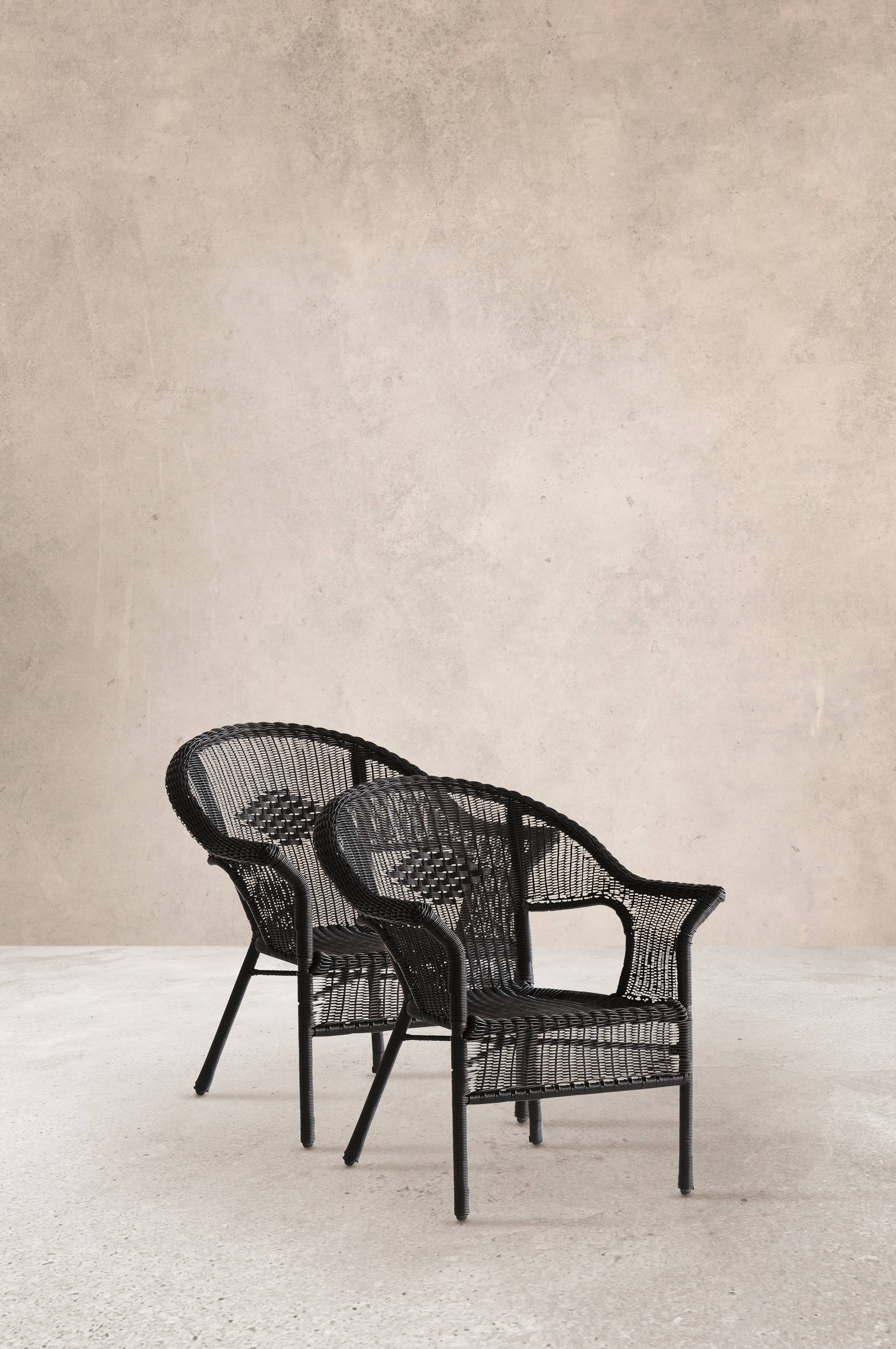 2er-Set Armlehnenstühle im charmanten Landhausstil. Klassische Korbstühle kommen nie aus der Mode und verbreiten einen schönen Retrolook. PROVENCE besteht aus Aluminium und robustem Kunstrattan; damit ist dieser Stuhl wetterfest und bedarf nur einer minimalen Pflege. Praktisch und gut! Das Modell kann man gut solo, aber auch zu mehreren um den Esstisch herum platzieren. Die Stühle sind zudem stapelbar.