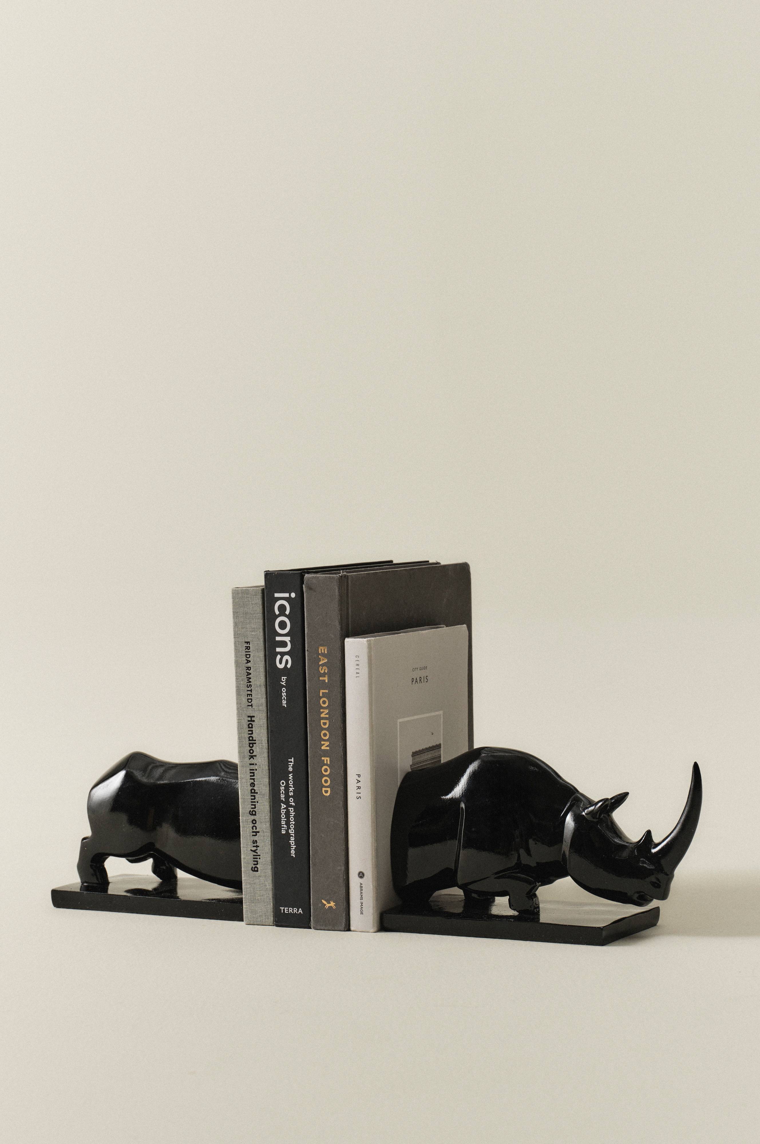 Zwei Buchstützen aus Polyresin, die von Hand veredelt und mit einer glänzenden Oberfläche bemalt wurden, sorgen dafür, dass Ihre Bücher perfekt in Ihrem Regal stehen. RHINO verleiht Ihrer Bibliothek zu Hause einen Hauch von Eleganz.