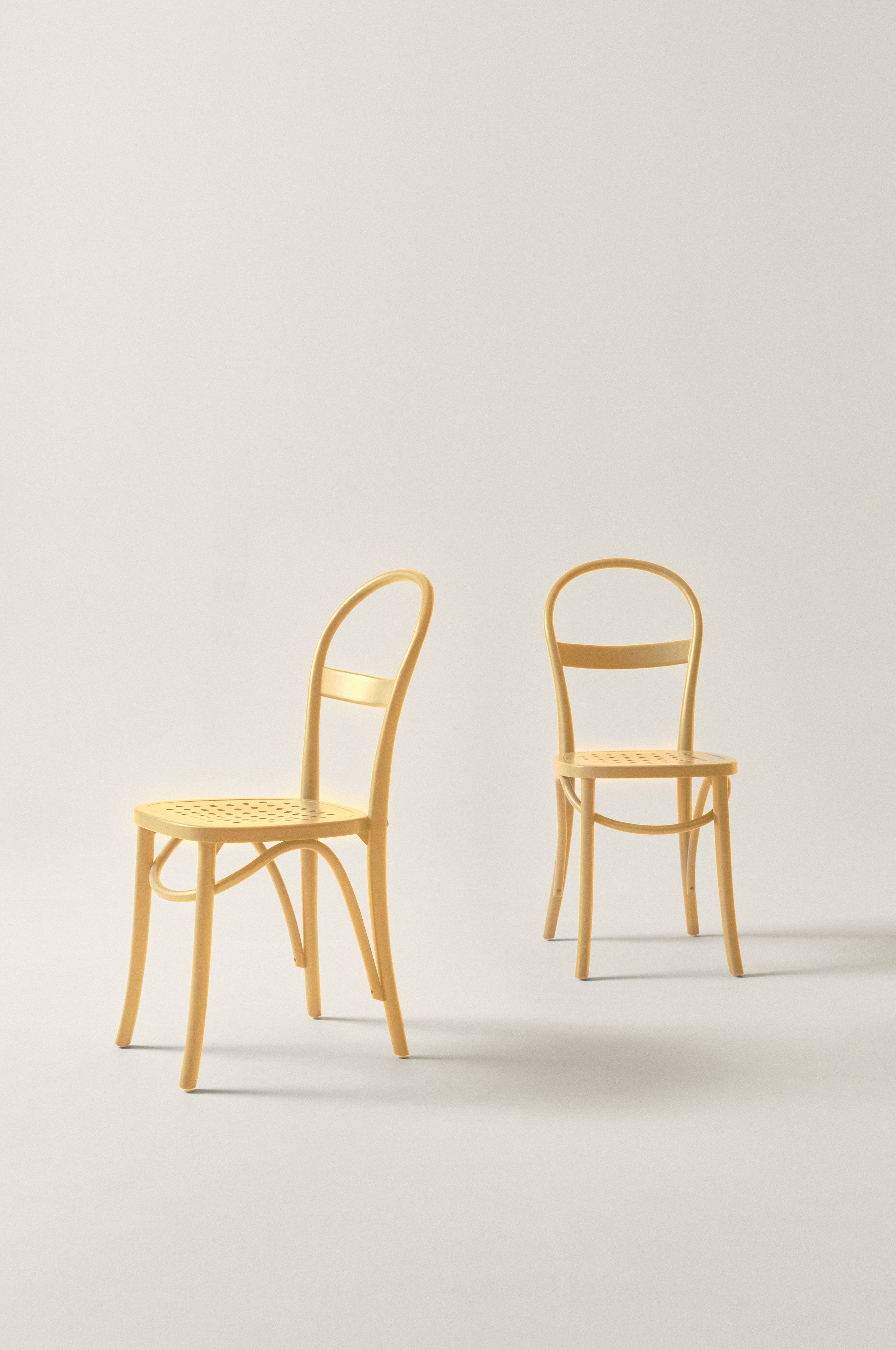 2 Stühle aus FSC-zertifiziertem Birkenholz, das mit wasserbasierter Farbe in schönen Nuancen lackiert wurde. Die dekorativ perforierte Sitzfläche besteht aus Furniersperrholz (ohne FSC-Siegel). RIPPATS nimmt unverkennbar Anleihen beim klassischen Kaffeehausstuhl, zeigt er sich doch mit runder Formgebung und hier mit einer besonderen Sitzfläche. Das Modell ist aus Massivholz gearbeitet, hat eine Sitzfläche aus Furniersperrholz und besticht durch das luftige, leichte Design.