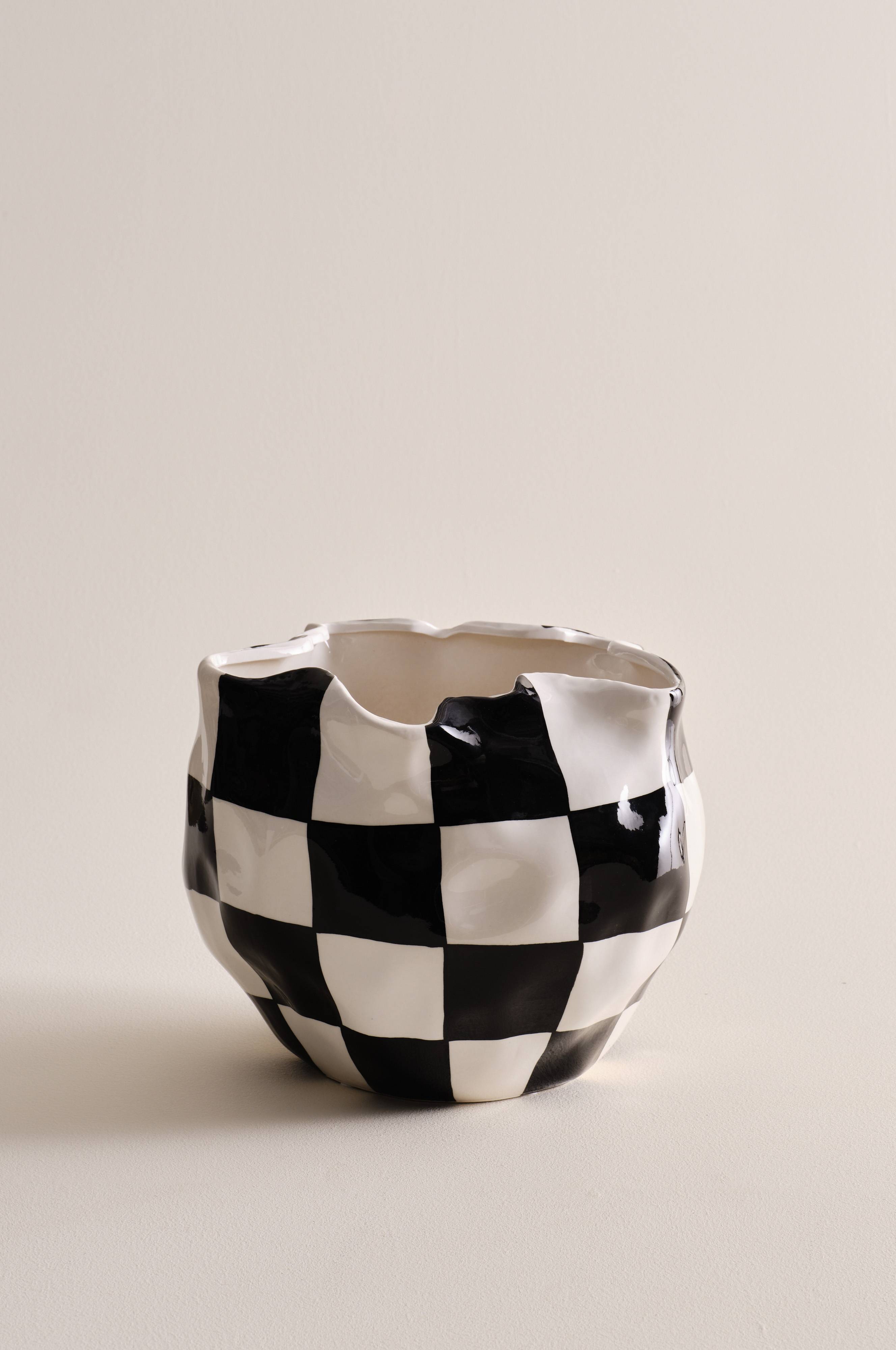 Handgearbeiteter Übertopf aus Keramik mit asymmetrischer, gewellter Form und schwarzweißem Schachbrettmuster. Muster und Form ergeben zusammen einen schönen Kontrast. Der Übertopf hat eine glänzende Glasur und ist sogar an der Innenseite glasiert. Da das Modell von Hand gefertigt wird, ist jedes Exemplar ein Unikat. Keramik ist feuchtigkeitsdurchlässig.