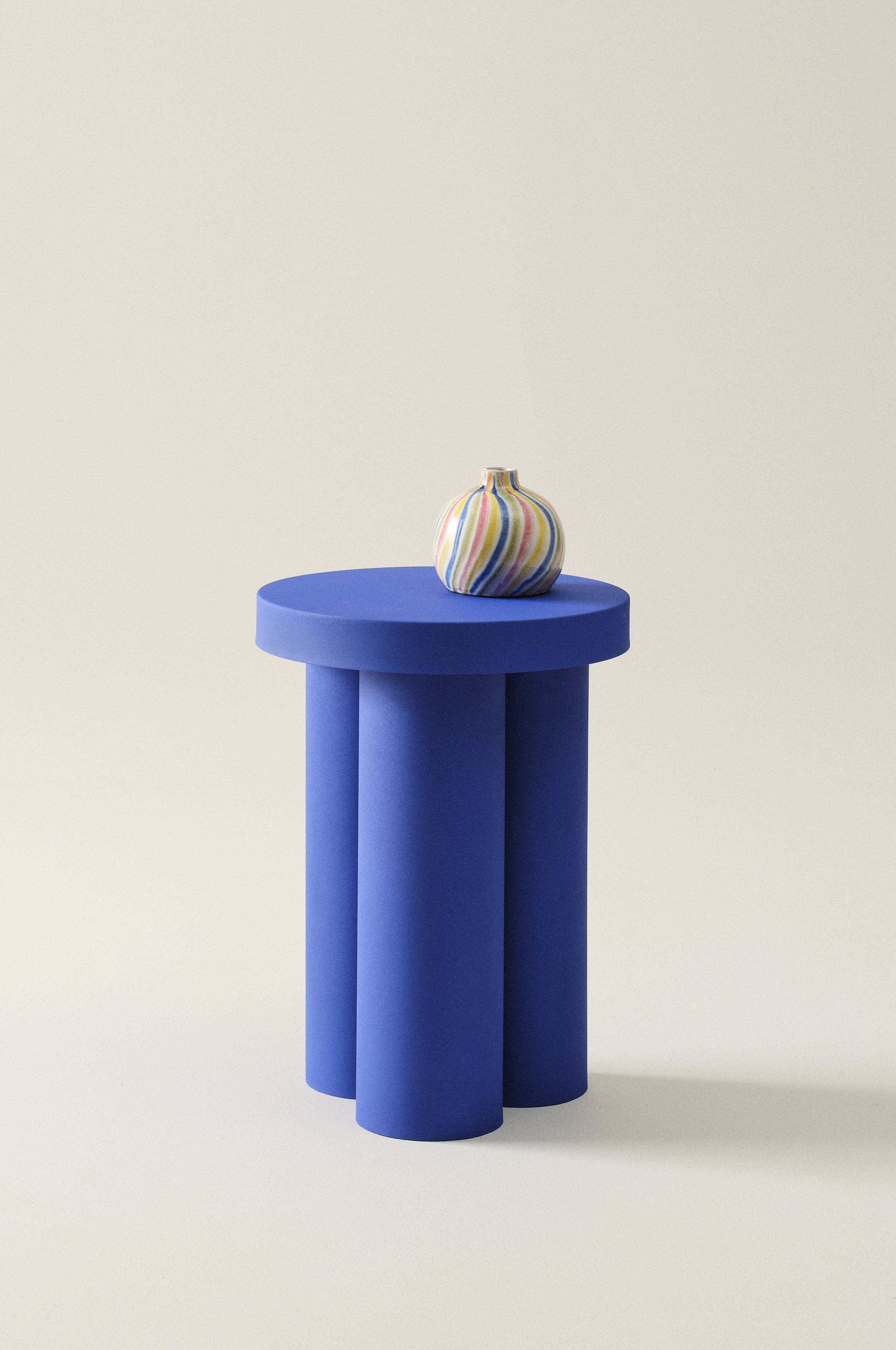 Beistelltisch aus Eisen mit Säulenfuß bestehend aus drei Rundrohren. Hier wurde im Zusammenspiel von runder Tischplatte und Fuß auf harmonische Proportionen geachtet. Der einfarbig pulverbeschichtete Tisch hat ein mattes Finish. Das Modell zaubert eine leichte, verspielte Atmosphäre in den Raum.