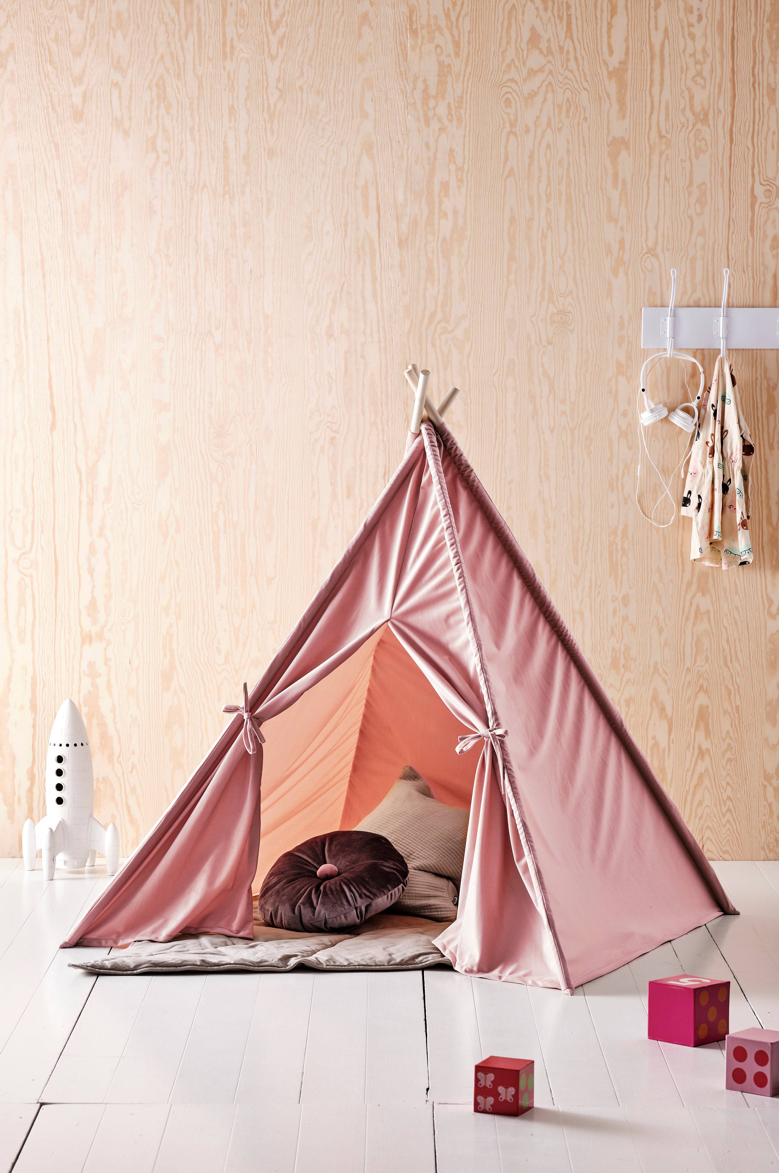 Spielzelt mit vier Seiten und vier Zeltstangen. Bänder an der Vorderseite. Die Zeltwände sind aus Polyester mit samtiger Haptik gearbeitet. Ein Spielzelt ist wie geschaffen für gemütliche Märchenstunden und bei allen Kindern beliebt. Dieses Spielzeug trägt die CE-Kennzeichnung und erfüllt damit alle gesetzlichen Auflagen der EU.