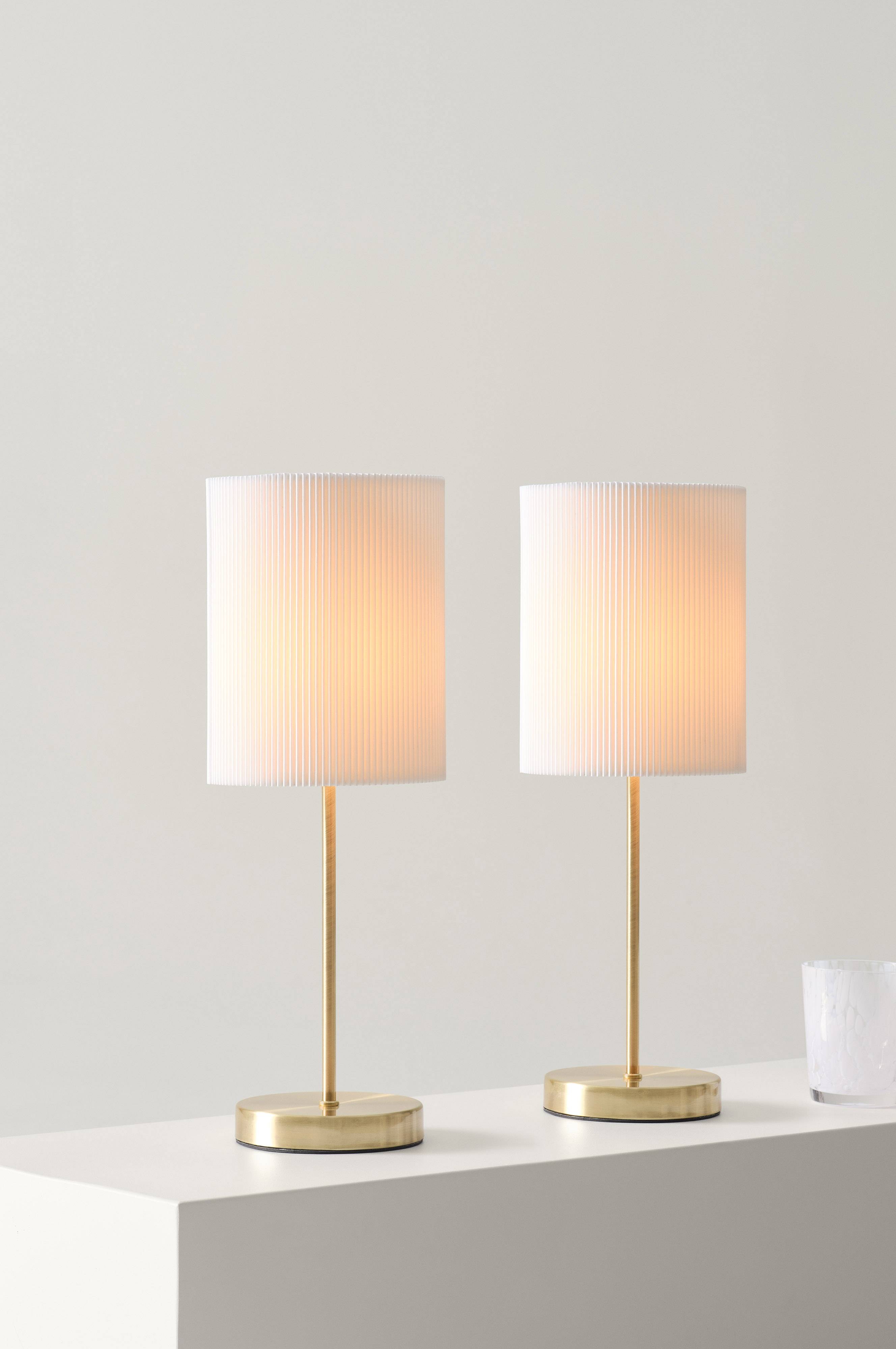 Zwei Tischlampen, jede Lampe hat einen schönen, plissierten Baumwollschirm, der einen sanften Schein verbreitet. Der Lampenfuß ist aus Eisen gefertigt. Transparentes PVC-Kabel mit Schalter am Kabel. Diese beiden Lampen sind perfekt, um deinem Wohnzimmer Eleganz zu verleihen, aber sie passen auch gut in deinen Flur, dein Schlafzimmer oder überall dort, wo du eine schöne Beleuchtung brauchst.
