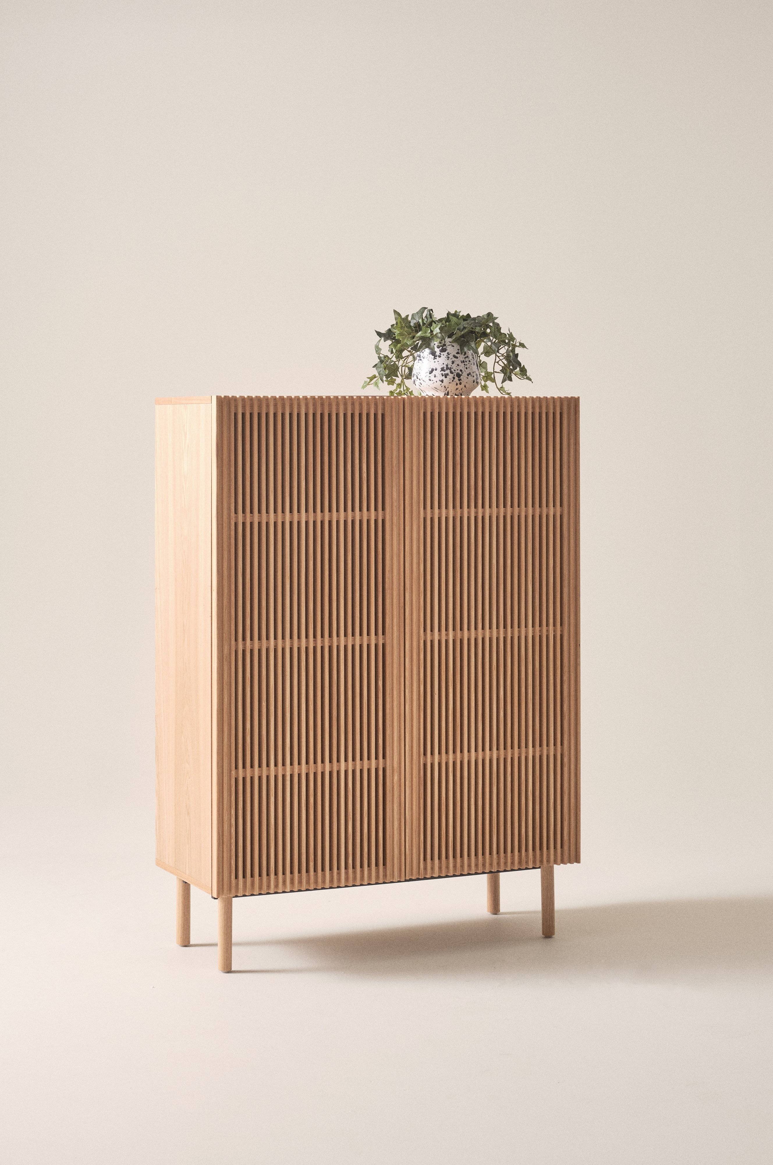 Ein Schrank mit eingebautem Schreibtisch. Bei diesem Schrank sind die Türen und Beine aus massiver Esche gefertigt, der Korpus ist aus MDF mit Eschenfurnier. Dieses Möbel, in dem sich Rechner und Schreibtischutensilien in der Freizeit verstecken lassen, ist ideal fürs Homeoffice. Hinter den Türen verbirgt sich ein ausziehbarer Schreibtisch und ein extra Regal für den Bildschirm. Darüber ist ein Freiraum für den Bildschirm vorgesehen, und das unterste Regal ist so geformt, dass beim Arbeiten genug Platz ist für die Beine. Der unverkennbar skandinavische Charakter und eine Prise Retro-Look sorgen bei diesem Modell für Natürlichkeit. Die Eschenrippen der schlichten Türen haben eine abgerundete Kante und lassen die Zwischenräume fast transparent wirken. Die geraden, runden Beine tragen zur optischen Leichtigkeit dieses Möbels bei. An der Rückseite sind Öffnungen für eventuelle Kabel. Inklusive Schrauben. Einige Montageschritte sind erforderlich. Inklusive Montageanleitung.