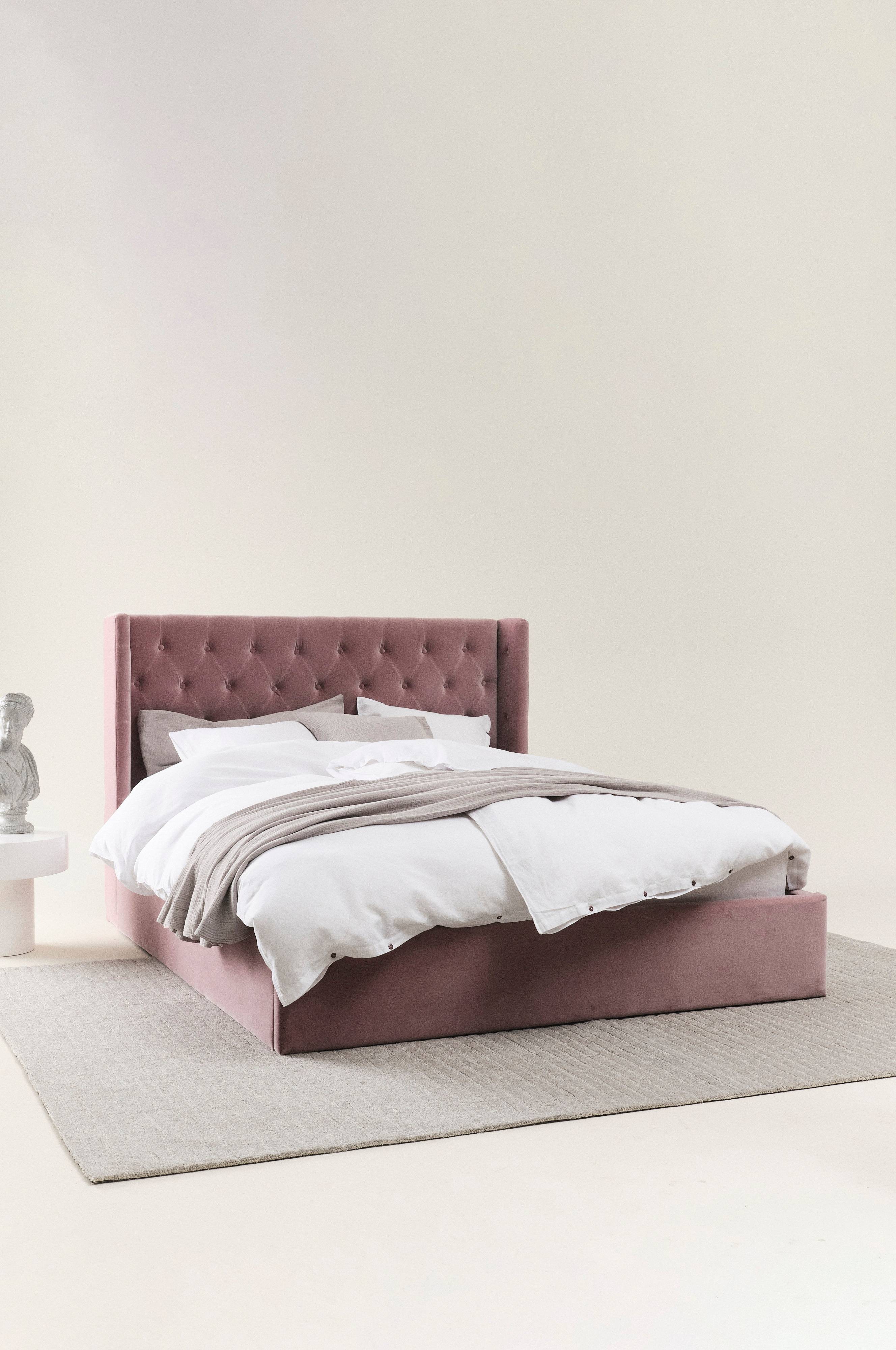 Ein mit schönem Samtstoff bezogenes, weich wattiertes Bettgestell. Das Kopfteil hat tief eingebrachte und bezogene Zierknöpfe und einen Stehsaum an den Seiten, der einen schönen Rahmen bildet. Die Seiten und das Fußteil sind stringent und glatt und der umlaufende Rahmen ist fast bodentief; lediglich ein kleiner Spalt sorgt für Luftzirkulation unter dem Bett. Der Rahmen hat einen Lattenrost aus Kiefernholz und wird mit zwei beliebigen Matratzen ergänzt. Die Matratzen sind nicht enthalten.