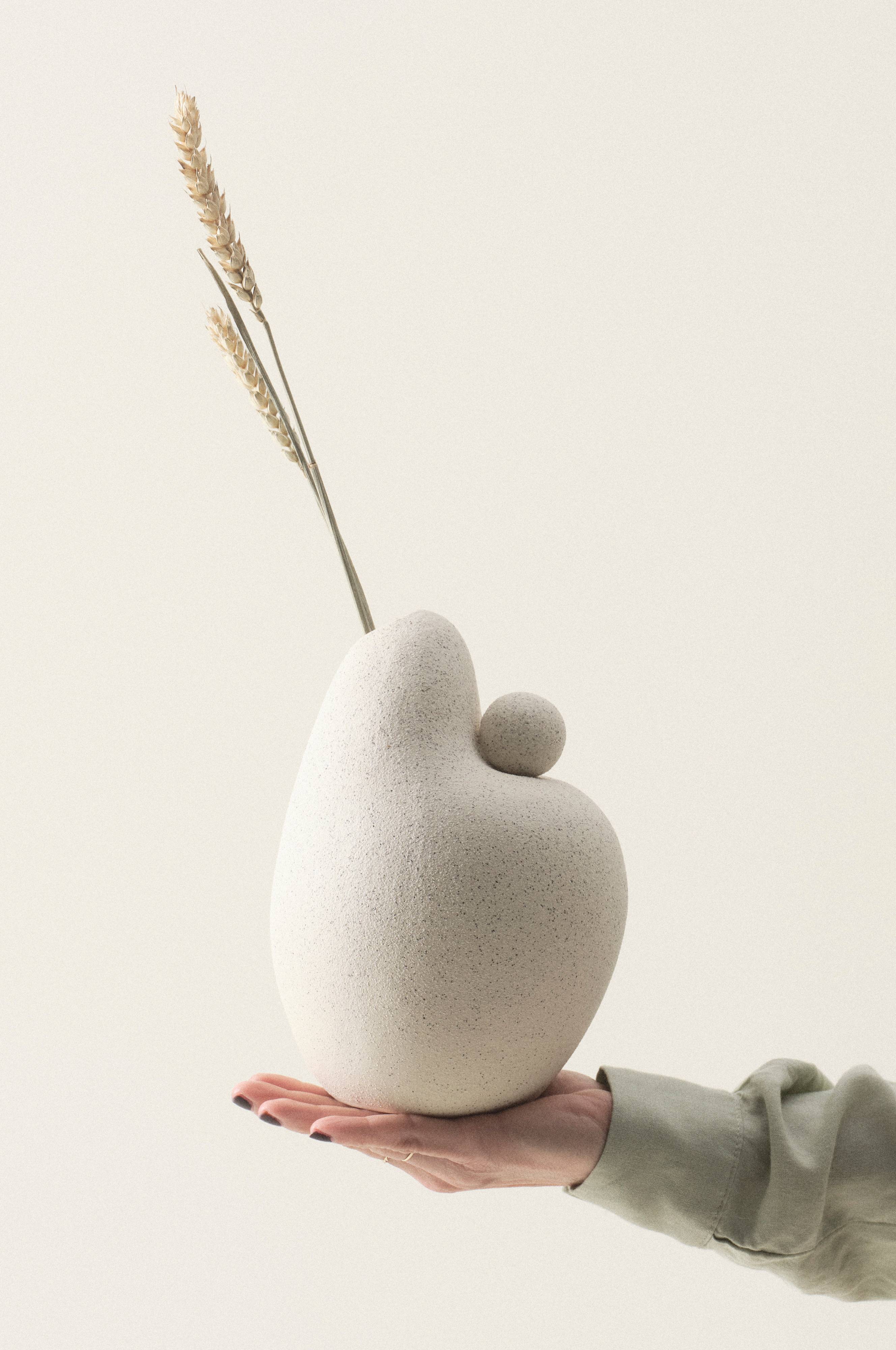 Handgearbeitete Keramikvase mit Steinglasur, die der Vase eine sandartige Oberfläche verleiht. Die Vase hat sanfte Formen und eine kleine Öffnung und eignet sich hervorragend für eine Blume oder einen Zweig. Da das Modell von Hand gefertigt wird, ist jedes Exemplar ein Unikat. Keramik ist feuchtigkeitsdurchlässig.