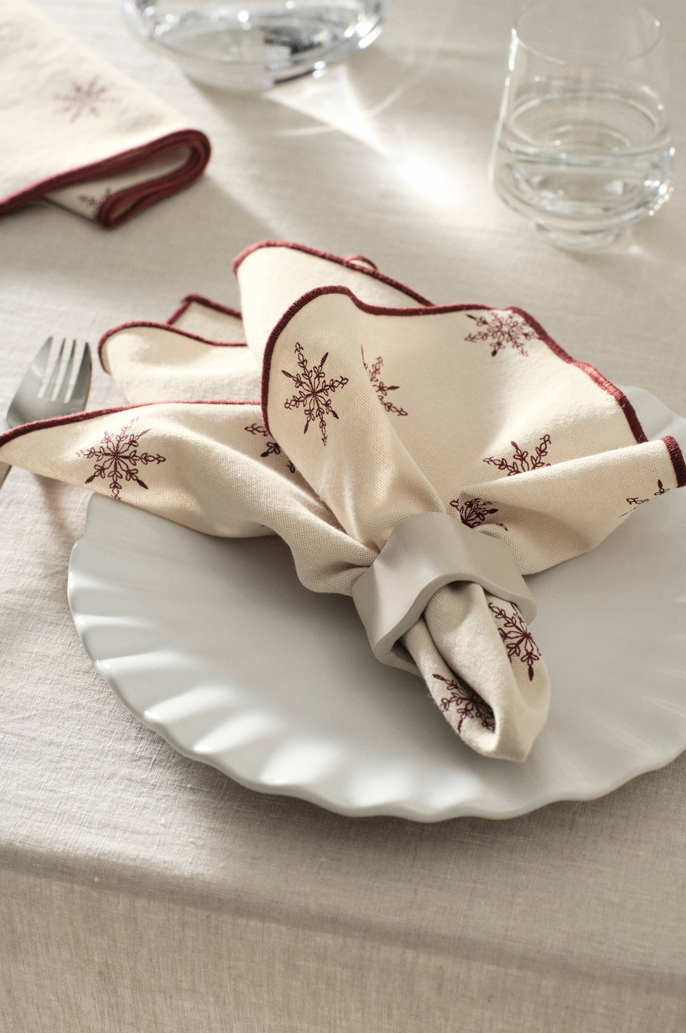 2 Servietten aus stückgewaschener Baumwolle mit rotem Musterprint auf naturbeigem Webgrund. Mit ihrem feinen, klassischen Schneesternmuster ist SNOW die perfekte Serviette in der Weihnachtszeit. Eingefasst sind die Servietten mit einer passenden roten Overlocknaht. Dieser Artikel ist stückgewaschen (d. h. nach dem Nähen gewaschen) und hat damit eine besonders weiche Haptik. Grammgewicht 170 g/m².