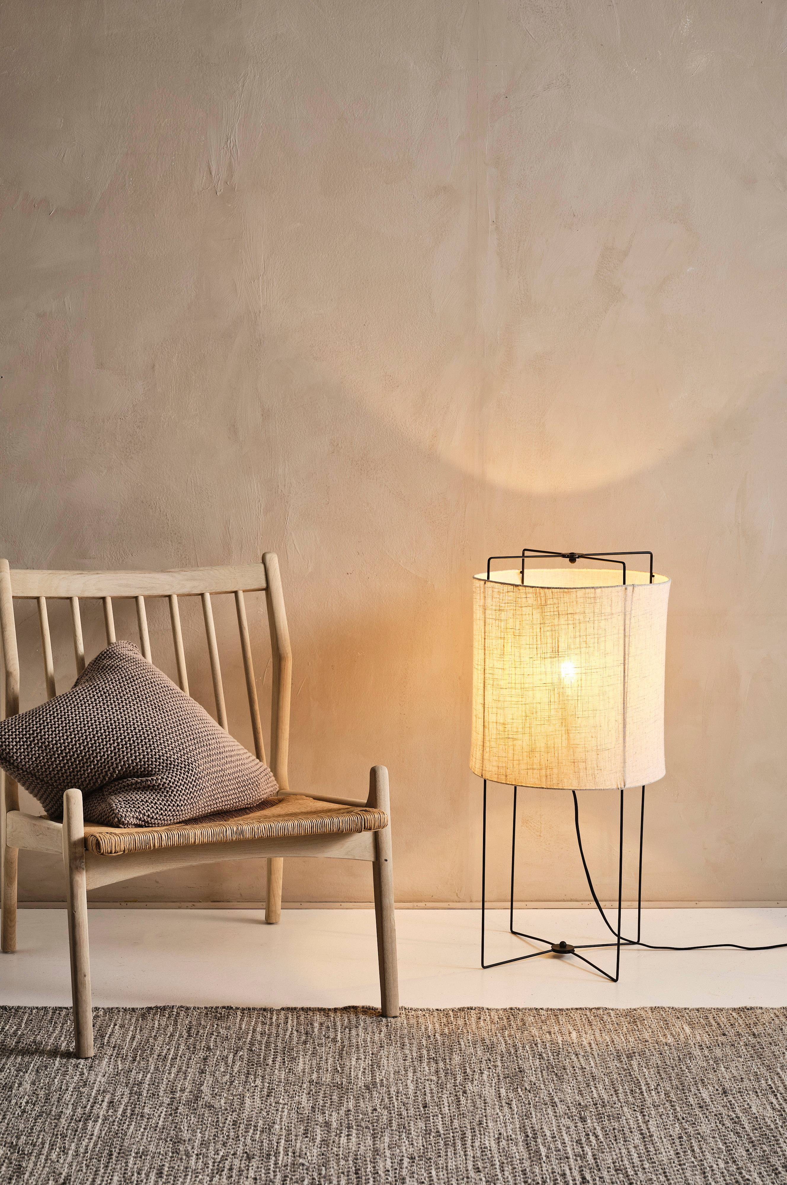 Stehlampe mit mattschwarzem Ständer mit schickem Leinenbezug mit unregelmäßiger Struktur. Der Bezug vermittelt ein natürliches Gefühl und der einfache Ständer erinnert an die 1950er Jahre. Schwarzes Kabel, Kabellänge 1,8 m. Einige Montageschritte sind erforderlich.