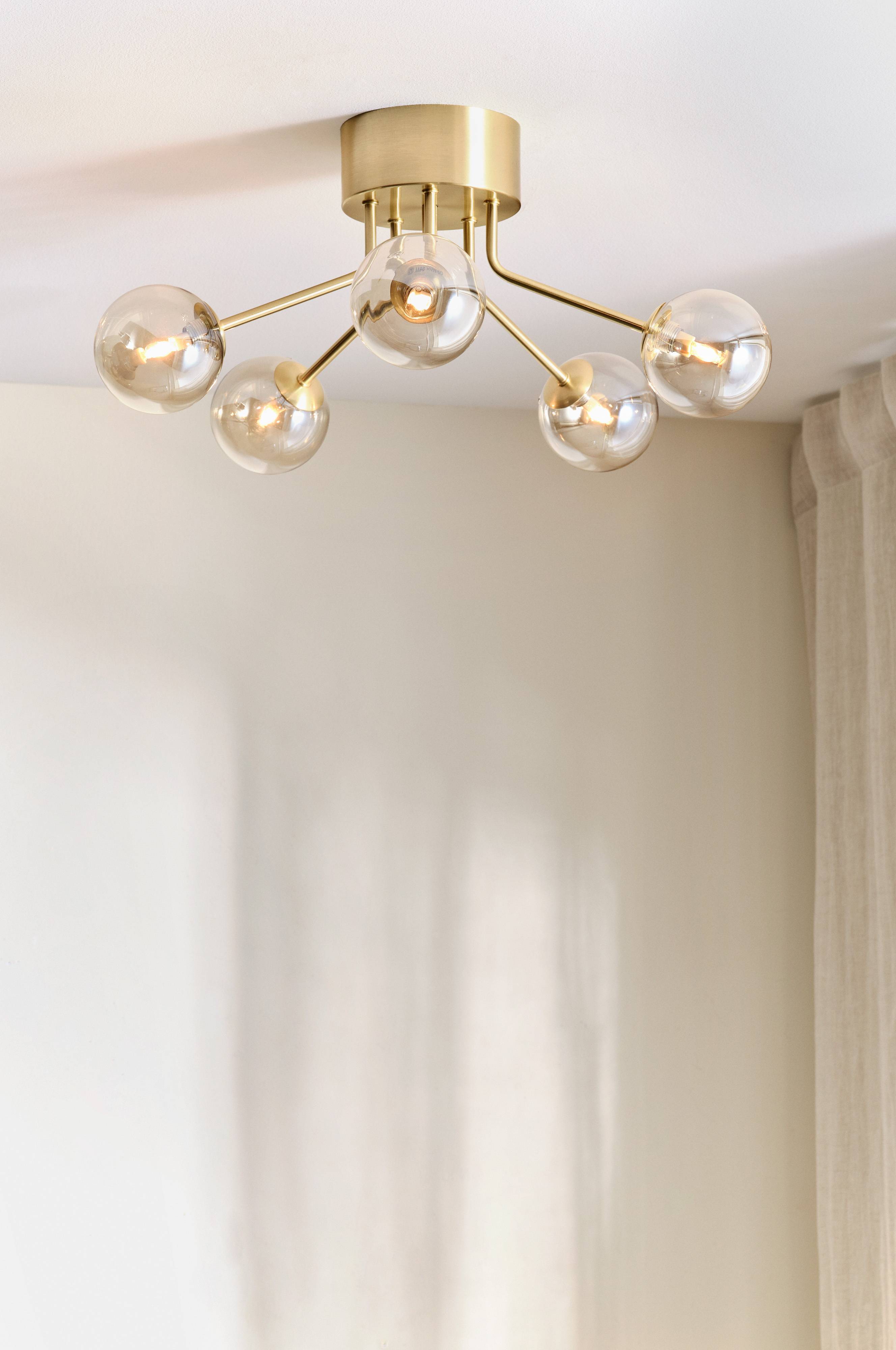 Deckenleuchte mit Eisenrahmen und dekorativen Klarglasschirmen, die ein gemütliches Licht verbreiten, wenn sie eingeschaltet sind. Der Deckenstecker ist aufgrund der neuen EU-Vorschriften nicht enthalten. Er ist separat erhältlich und heißt ROOF EARTH Deckenstecker.