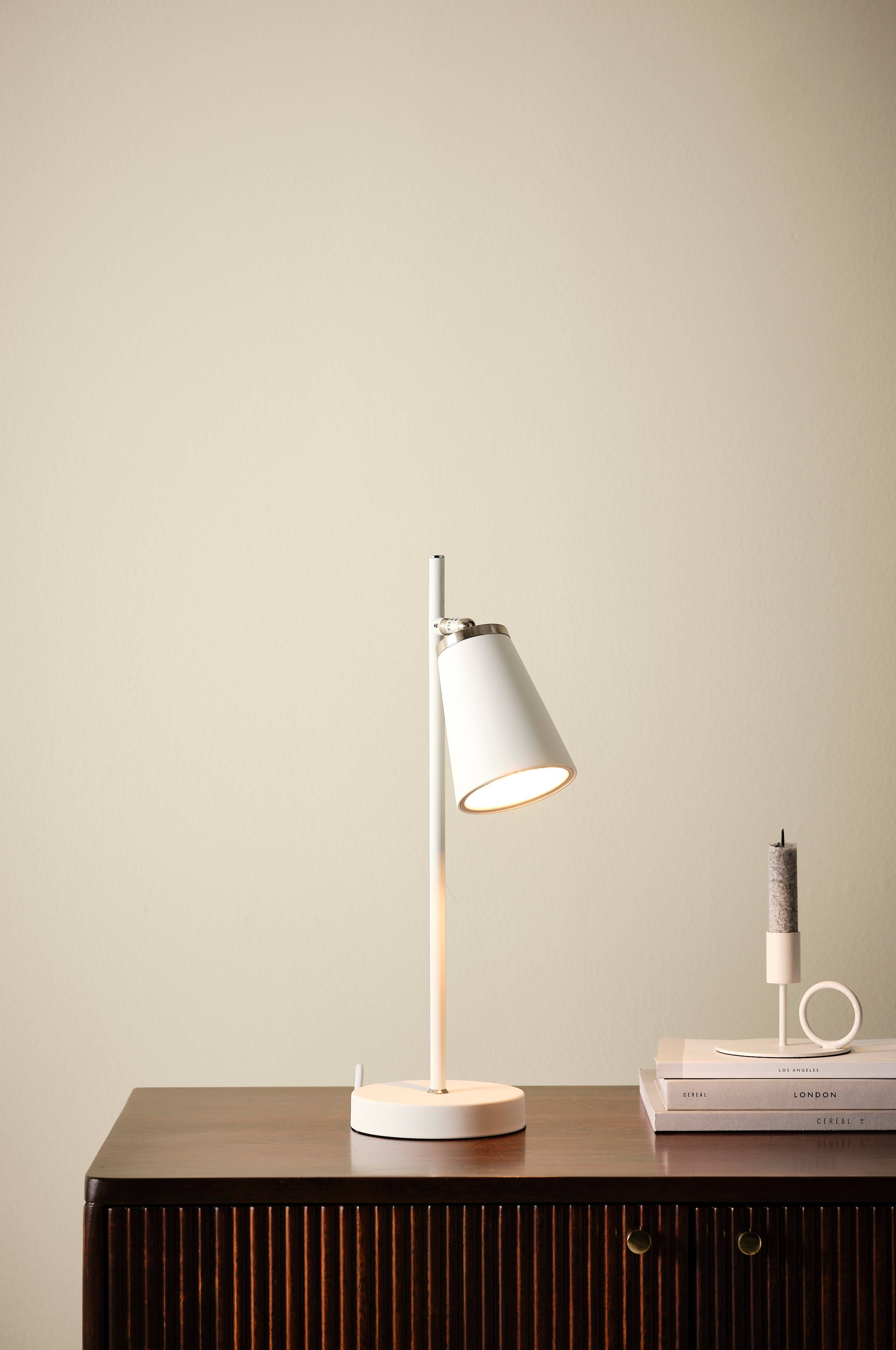 Tischleuchte aus lackiertem Metall mit goldfarbenen Details. Die Leuchte lässt sich einfach aufstellen und hat eine stilvolle, moderne Ausstrahlung. Schwarzes Kabel, Kabellänge 1,7 m.