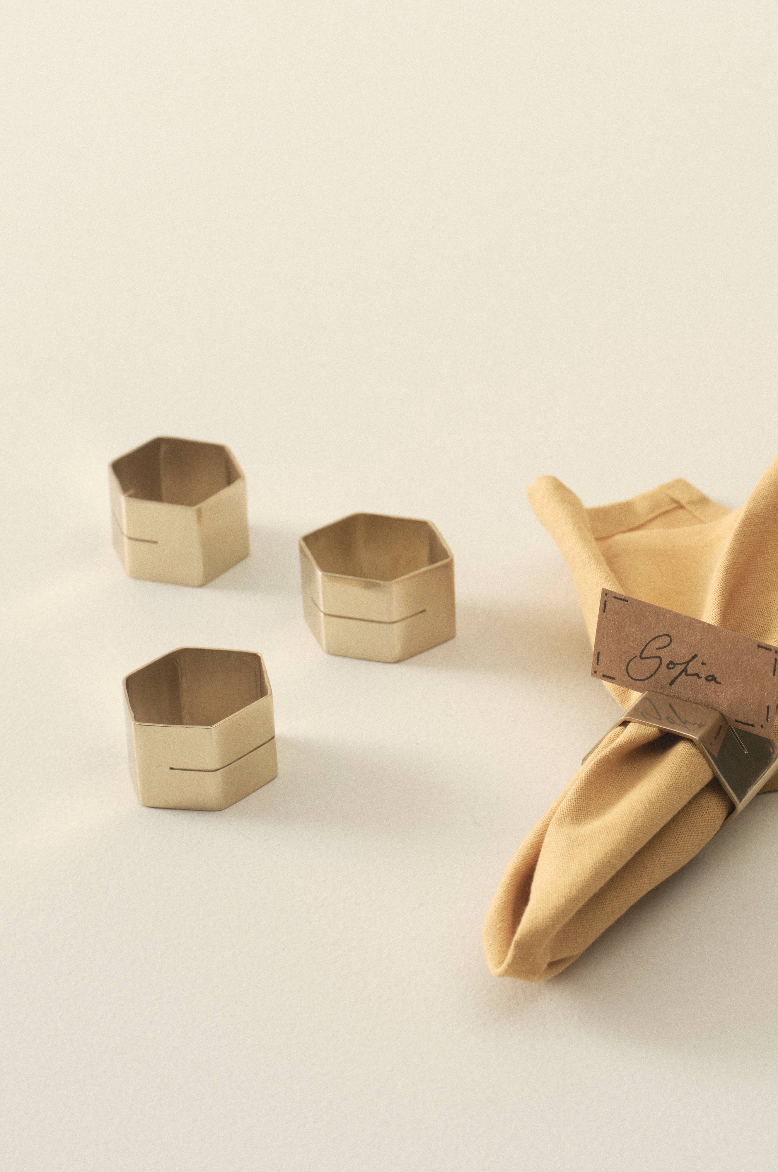 Diese 4 Serviettenringe haben eine kleine Aussparung für die Tischkarte und sind daher besonders praktisch. Die sechseckigen Serviettenringe sind aus Aluminium gearbeitet. In der Farbe Gold ist das Modell plattiert.