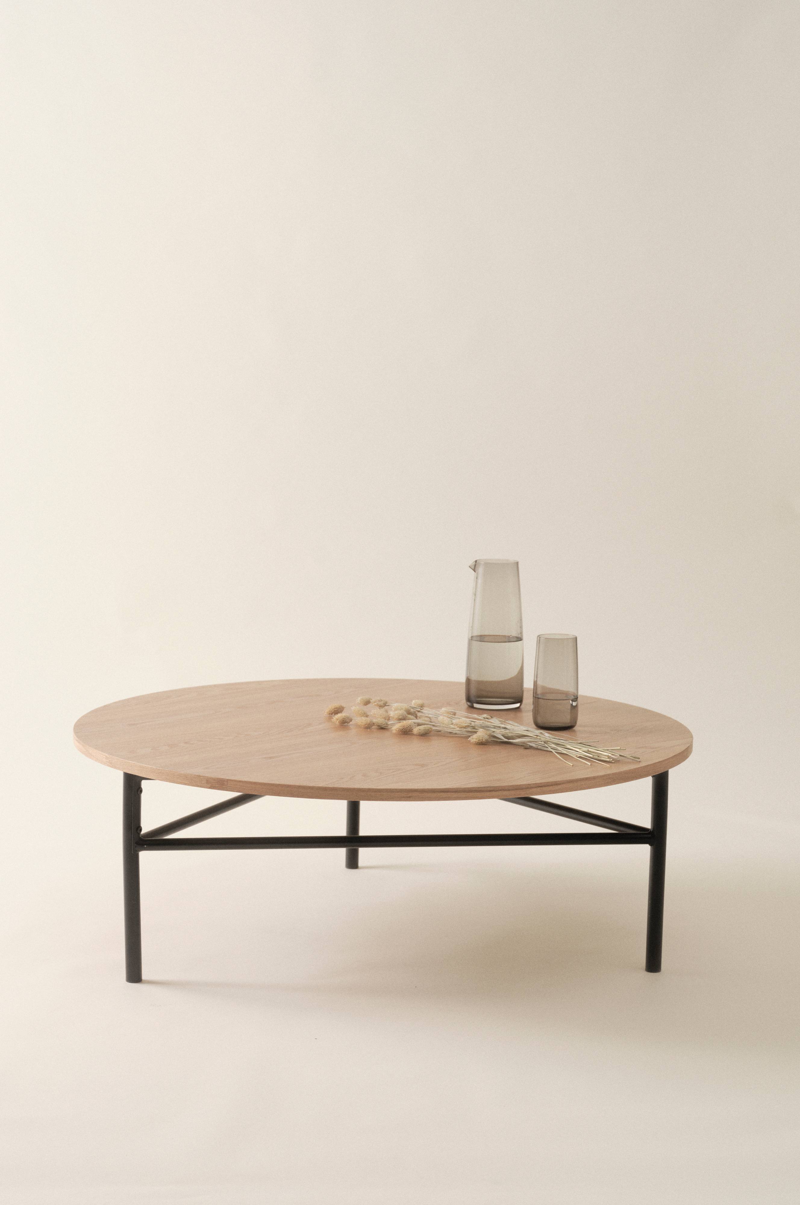Runder Couchtisch mit Beinen aus Stahl und Tischplatte aus MDF mit Eschenfurnier. Das dreibeinige Gestell ist schwarz lackiert. Einige Montageschritte sind erforderlich. Inklusive Montageanleitung.