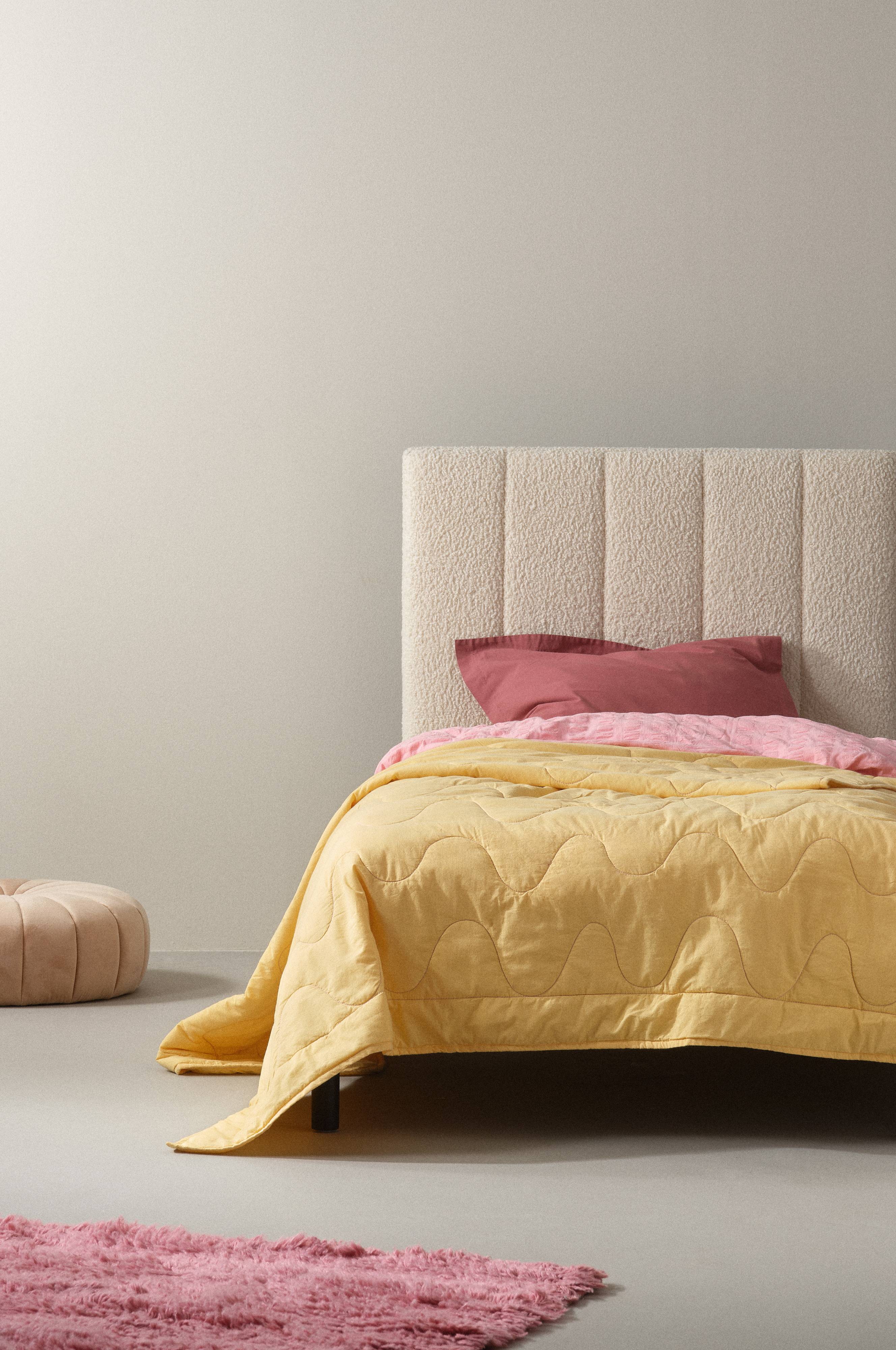 Dünne und geschmeidige Tagesdecke, die sich leicht ausbreiten lässt. Ideal auch als zusätzliche Decke und leicht zu waschen. Bio-Baumwolle. Gestepptes Wellenmuster, Nähte in abweichender Farbe. Die Tagesdecke ist mit Polyester gefüllt, das durch die Steppung fixiert ist. Das Modell aus Baumwolle ist stückgewaschen und besticht durch die besonders weiche Haptik. Die Tagesdecke ist wendbar und hat zwei identische Seiten.