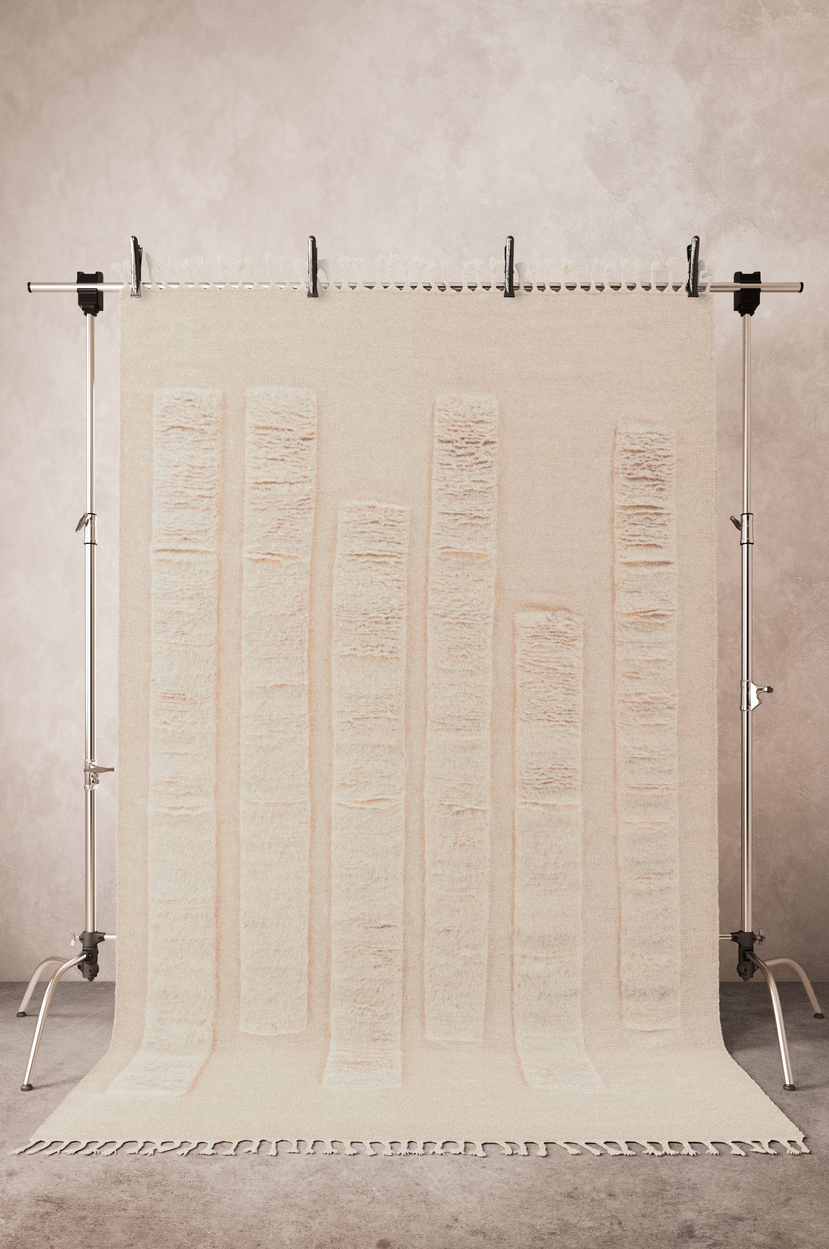Flach gewebter, handgeknüpfter Wollteppich mit dekorativem Muster im geknüpften Flor. Der Teppich hat an den Stirnseiten eine hübsche, eingeflochtene Fransenkante. Wolle ist ein natürliches Material, das warm und weich ist. Da das Modell von Hand gefertigt wird, ist jeder Teppich ein Unikat. Fransenlänge 7 cm. Florhöhe 2,6 cm. Dicke 2,9 cm. 2200 g/m².
