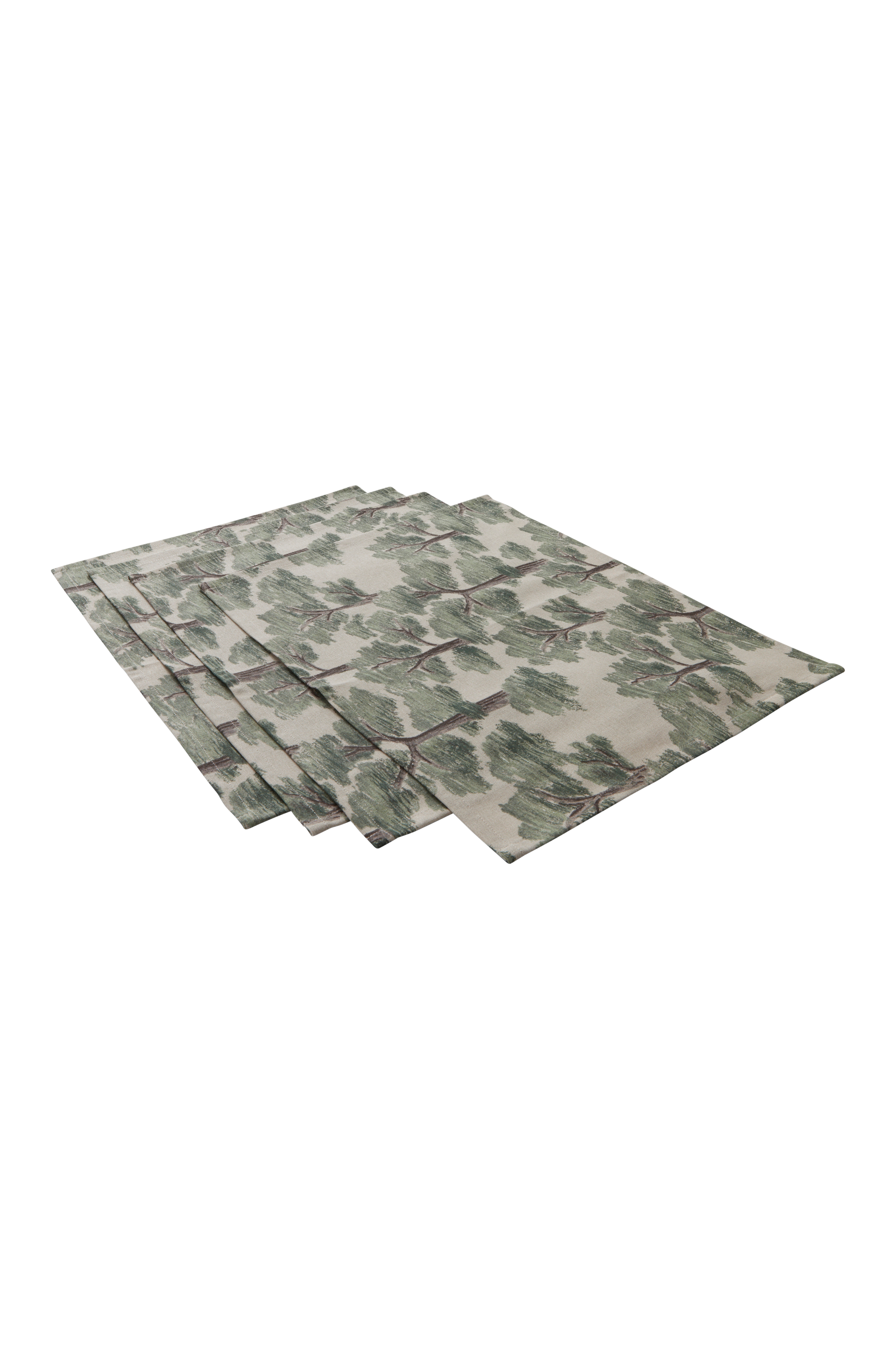 Die vier bedruckten LUNDASKOG-Tischsets aus einem etwas feineren, sehr geschmeidigen Gewebe weisen ein harmonisches, leicht stilisiertes Baummuster auf, das sehr lebhaft wirkt. Die edle Leinenmischung lässt das hübsche Muster sehr wirkungsvoll hervortreten.