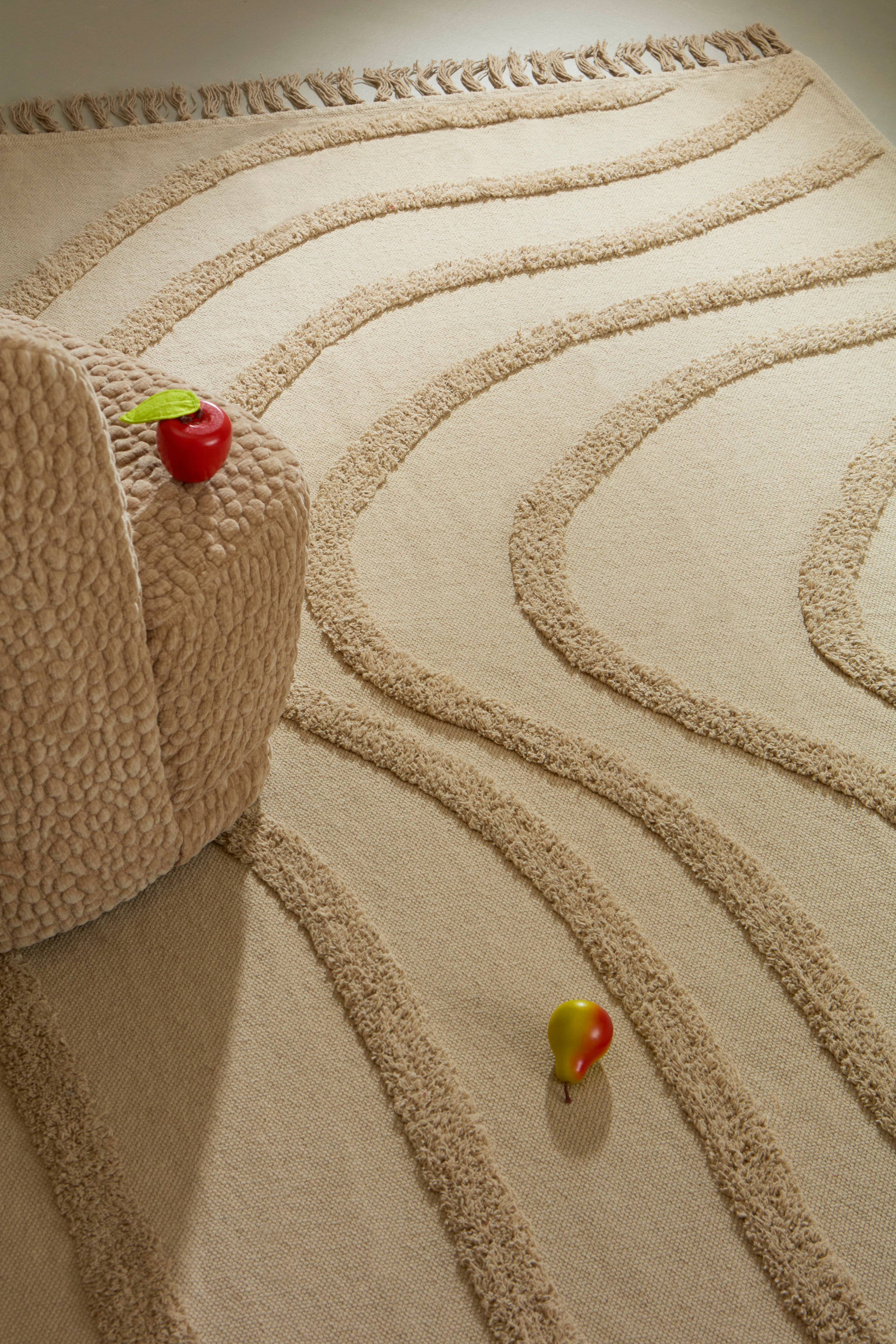 Webteppich aus Baumwolle mit getufteten Streifen, die dem Flor ein schönes Wellenmuster verleihen. Mit schönen geknoteten Fransen an den Stirnseiten. Fransenlänge 8 cm. Florhöhe 1 cm. Dicke 1,1 cm. 1235 g/m².