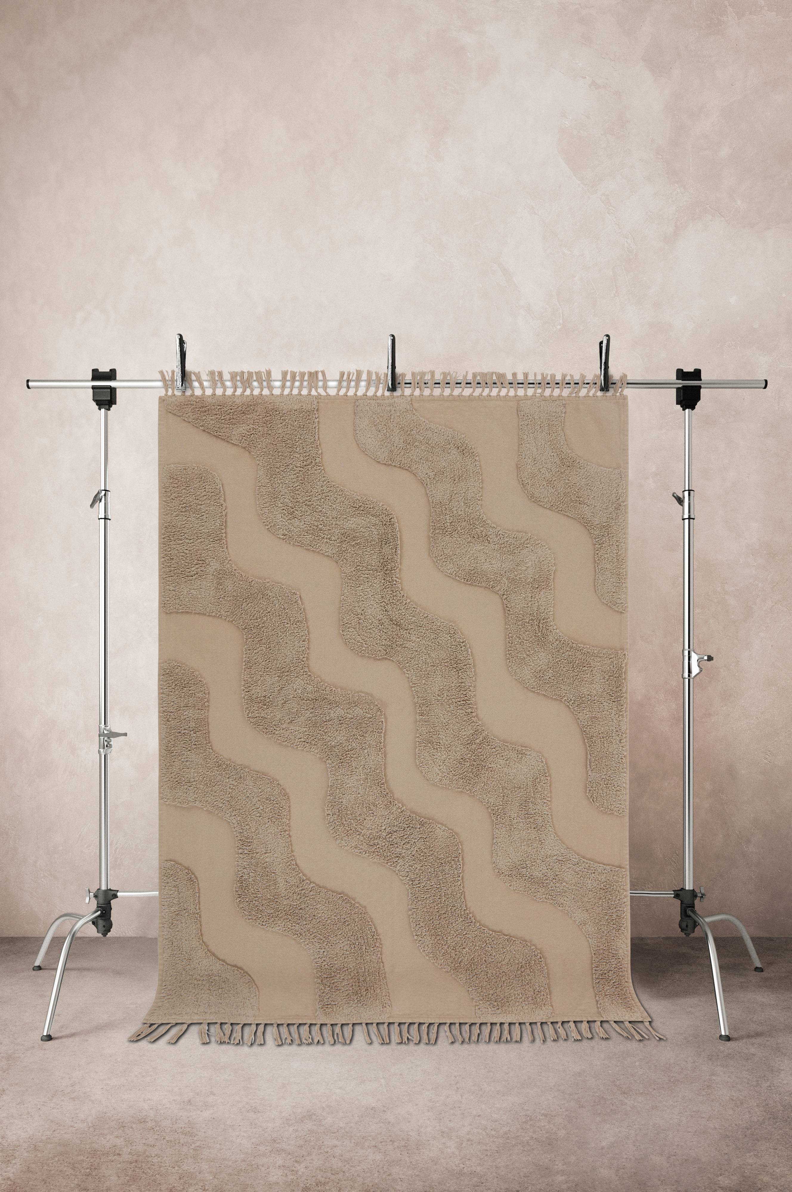 Webteppich aus Baumwolle mit getufteten Partien, die ein schönes Wellenmuster ergeben. Mit schönen geknoteten Fransen an den Stirnseiten. Fransenlänge 8 cm. Florhöhe 1 cm. Dicke 1,1 cm. 1560 g/m².