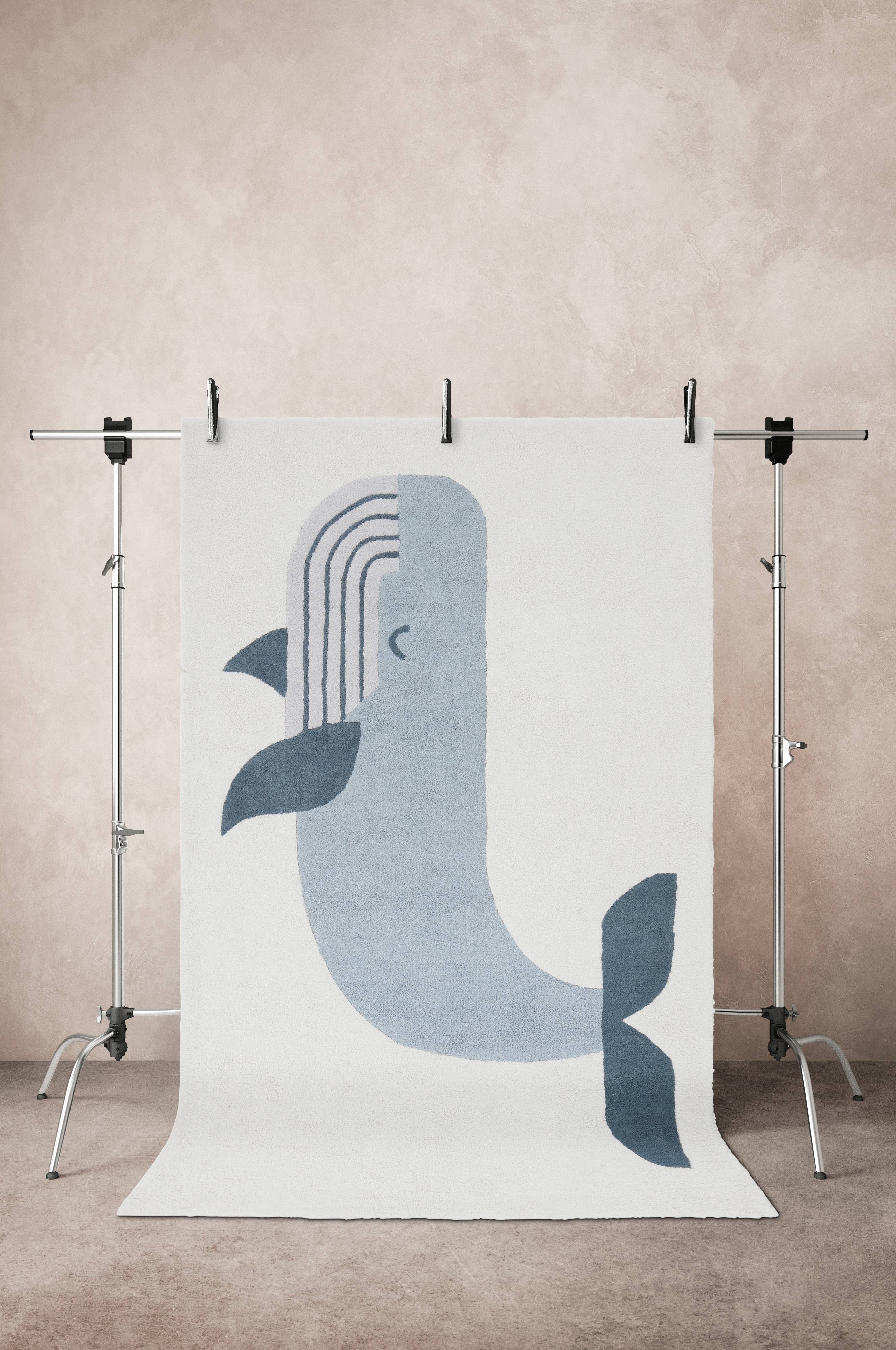 Herrlicher handgetufteter Teppich aus Bio-Baumwolle, mit Walmotiv in harmonischen Farben. Der weiche Teppich dient als bequeme Unterlage beim Spielen auf dem Fußboden. Florhöhe 0,9‒1,1 cm. Dicke 1,4‒1,5 cm. 3200‒3400 g/m².