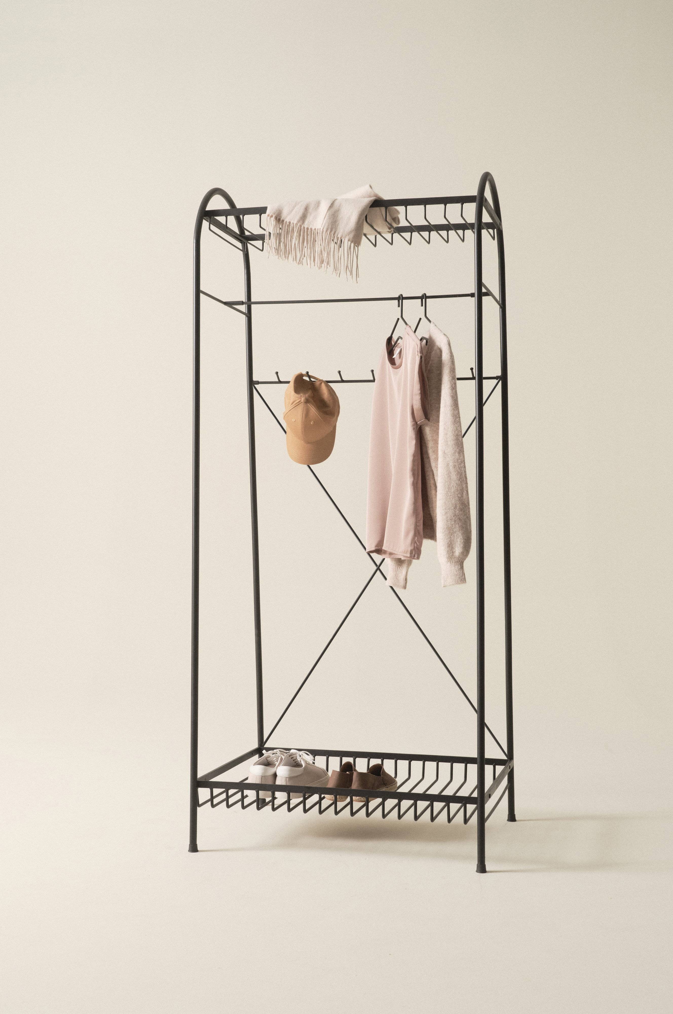 Praktische Garderobe aus Eisen. Die Garderobe hat eine Stange für Kleiderbügel, mehrere Haken für z. B. Taschen, eine Hutablage oben und eine Schuhablage unten. WINSTON ist gleichermaßen schön wie praktisch. Die Garderobe hat ein pulverbeschichtetes Finish. Kleiderbügel separat erhältlich. Einige Montageschritte sind erforderlich. Inklusive Montageanleitung.