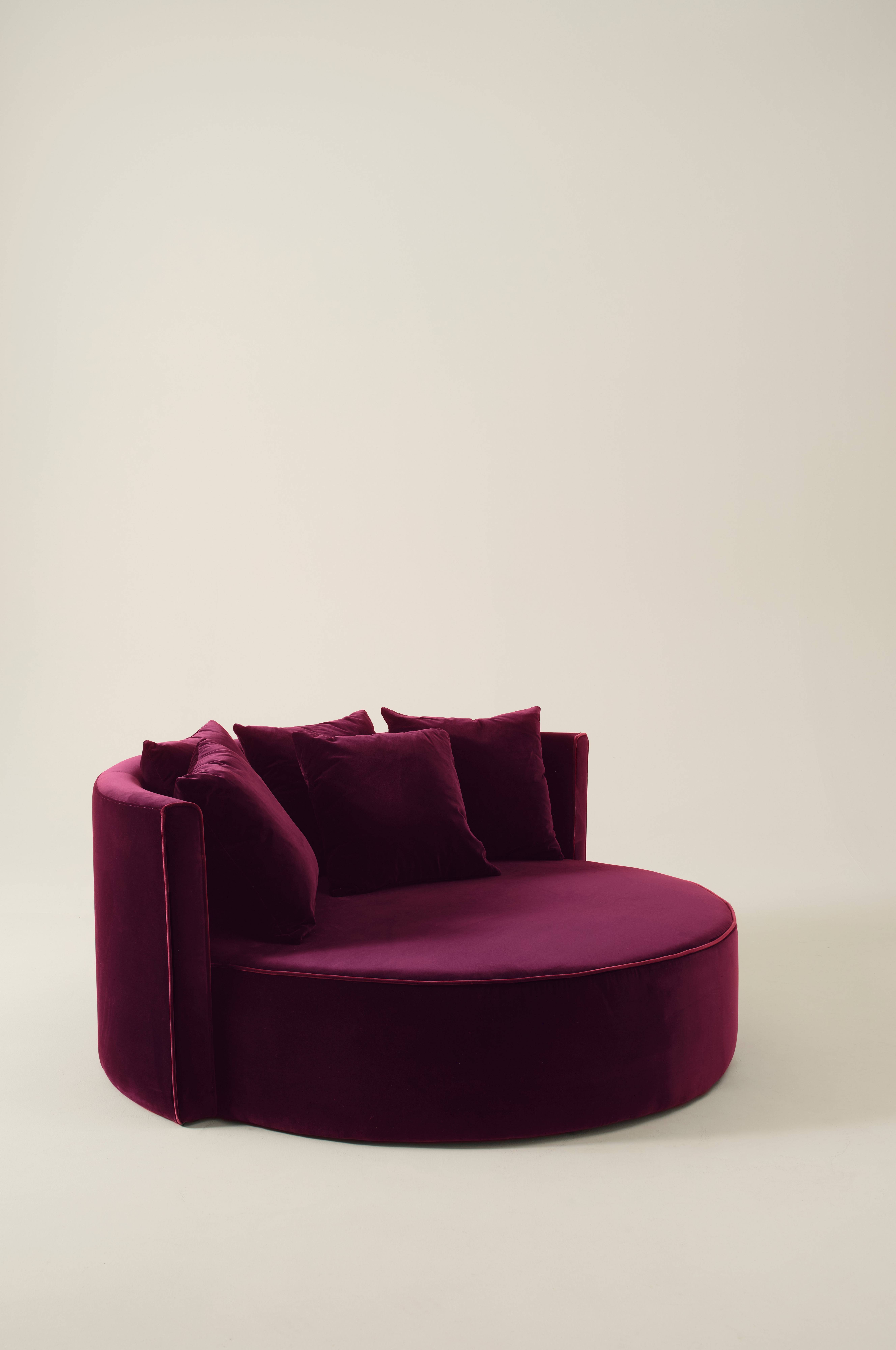 Rundes Samtsofa mit extra strapazierfähigem Baumwoll- und Polyester-Samtbezug. WYOMING hat ein stabiles Gestell aus Kiefer und Sperrholz und bietet dank der fantastischen Kaltschaumstruktur, der Zickzack-Federung, der elastischen Gurte und der bequemen Polsterung aus Federn und Kugelfasern einen hohen Sitzkomfort. Die Rückenkissen sind mit Federn und Kugelfasern gepolstert, damit du dich bequem anlehnen kannst.