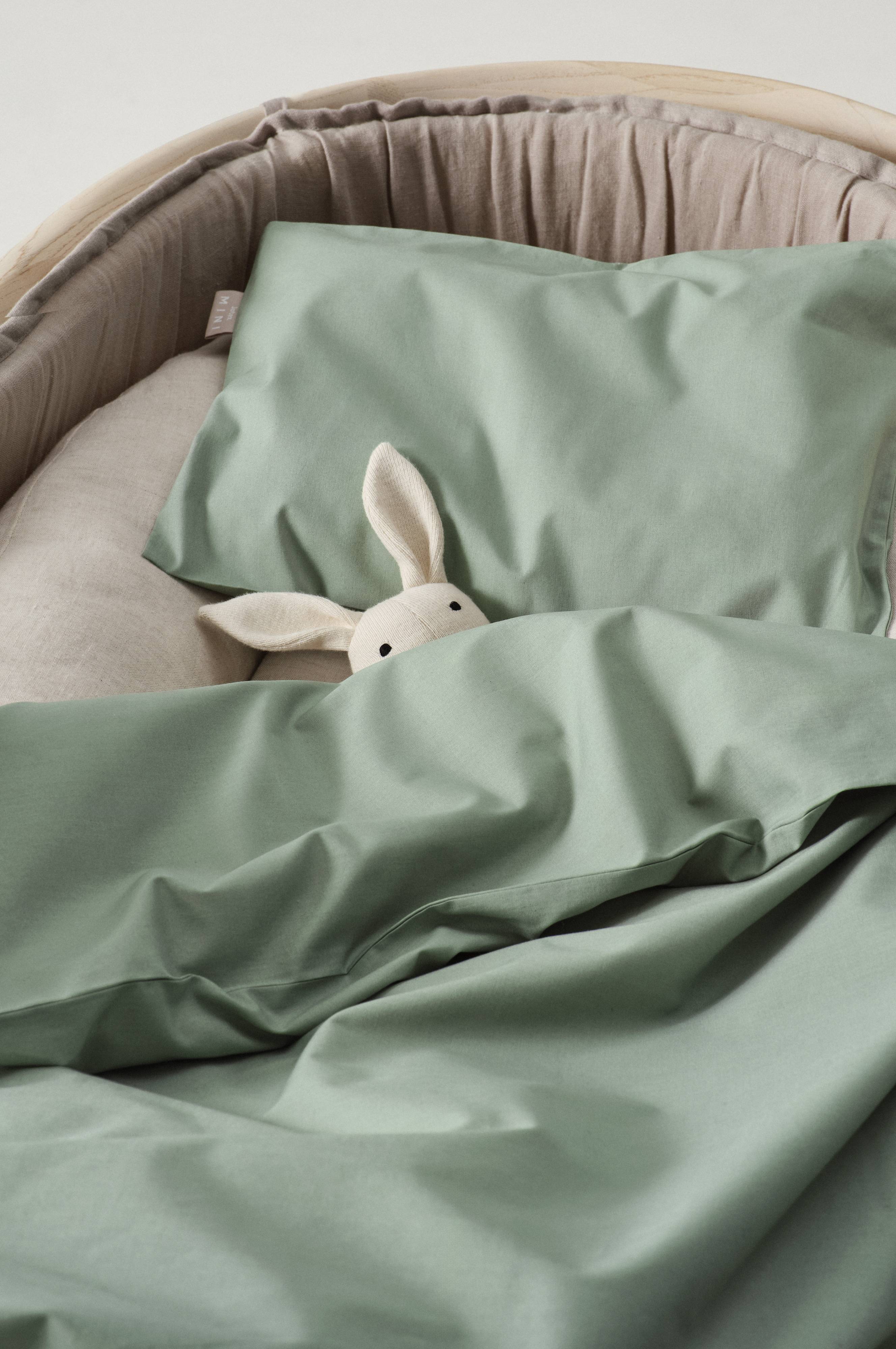 2-teilige einfarbige Bettwäsche mit einem Bett- und einem Kopfkissenbezug aus herrlichem Bio-Baumwollperkal. Das Set ist für Kinderwagen und Wiege vorgesehen. Perkal wird mit feinstem Baumwollgarn gewebt und ist besonders weich und hautfreundlich. Fadendichte 200 TC. (Mit der Fadendichte bzw. dem TC-Wert (Thread Count) wird die Anzahl der Fäden in Kette und Schuss pro Quadratzoll angegeben. Je höher die Fadendichte, desto höher die Qualität.)