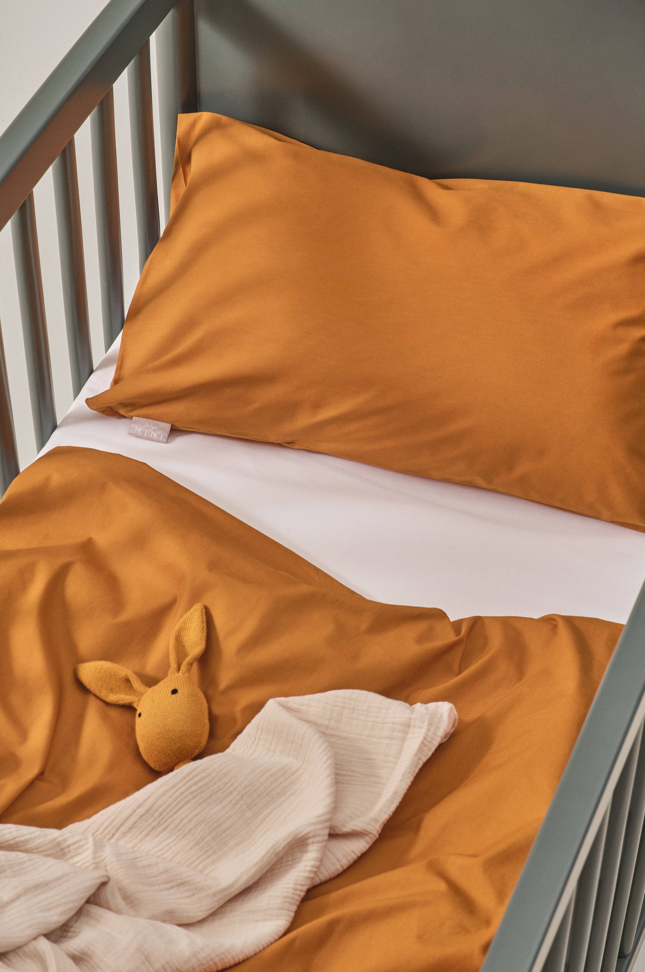 2-teilige einfarbige Bettwäsche mit einem Bett- und einem Kopfkissenbezug aus herrlichem Bio-Baumwollperkal. Das Set ist auf Babybetten abgestimmt. Perkal wird mit feinstem Baumwollgarn gewebt und ist besonders weich und hautfreundlich. Fadendichte 200 TC. (Mit der Fadendichte bzw. dem TC-Wert (Thread Count) wird die Anzahl der Fäden in Kette und Schuss pro Quadratzoll angegeben. Je höher die Fadendichte, desto höher die Qualität.)