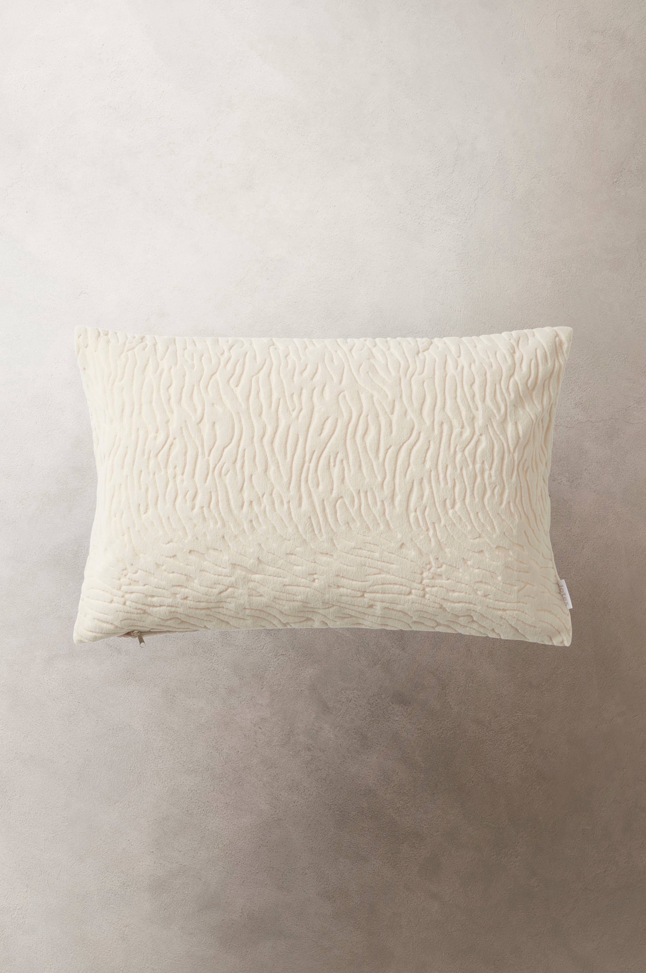 Kissenhülle aus einer schönen Ausbrenner-Samtqualität mit Ton in Ton gehaltenem Zebramuster. Aus weichem Polyester gearbeitet. Reißverschluss unten.